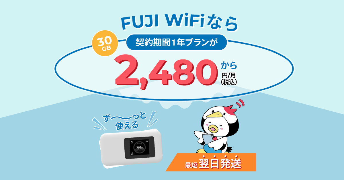 FUJI WiFi(フジワイファイ)の公式サイト。ずーっとお得につかえちゃう!FUJI WiFiは、Webから簡単にお申込みできるモバイルWi-Fiルーターのレンタルサービス。選べる4つのプランでスマ...