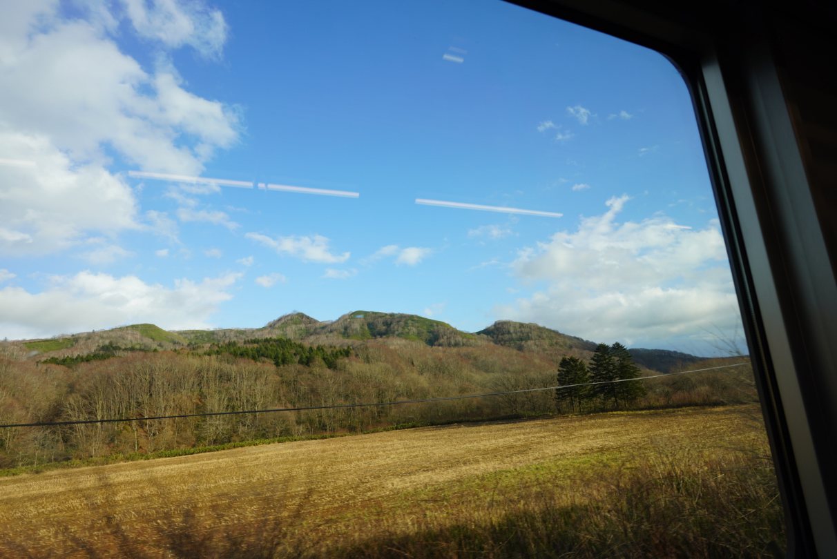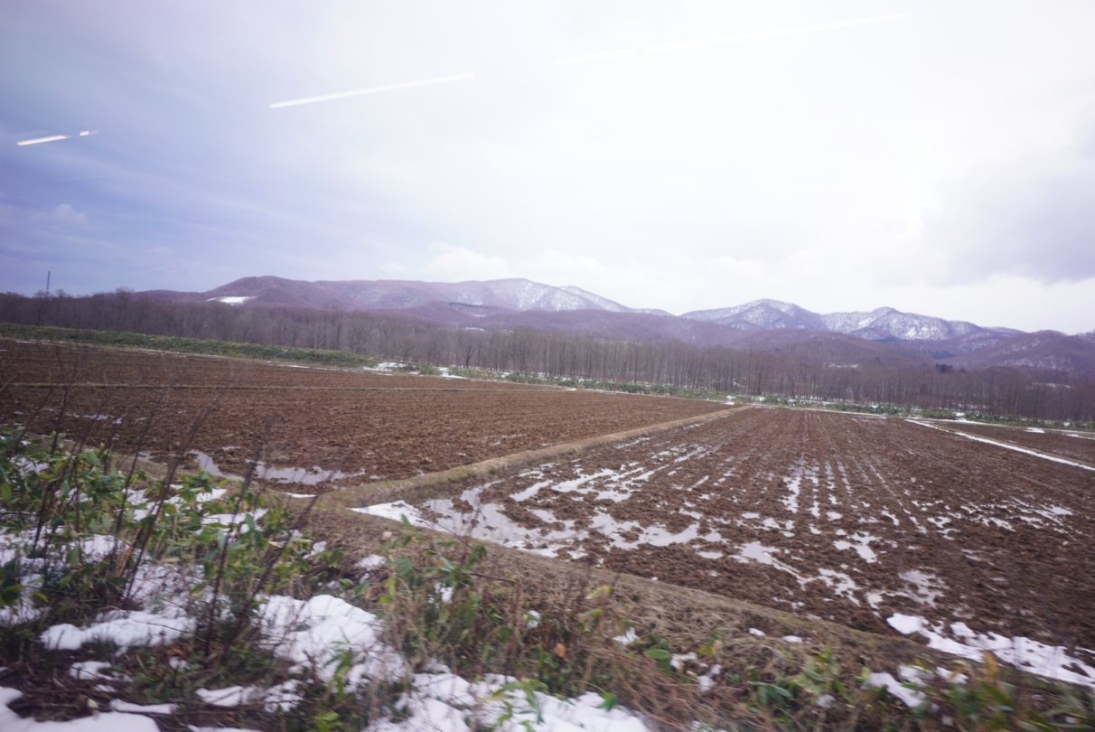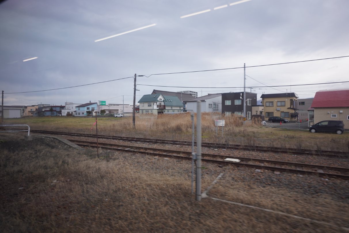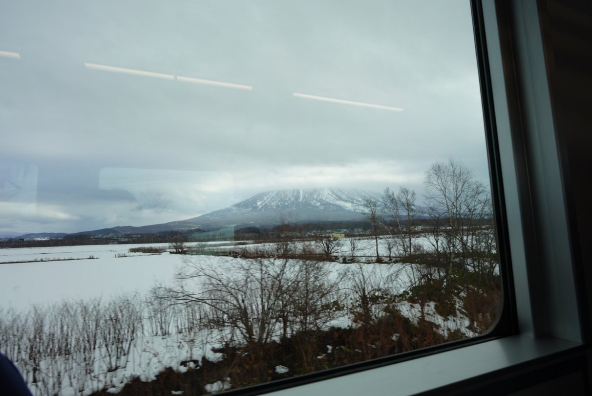 倶知安駅を出ると左手に羊蹄山を眺めながら進みます。あいにくの天気なので山頂まで綺麗な絶景という風にはならなかったのが残念。冬の晴天なら綺麗なんだろうなぁ。