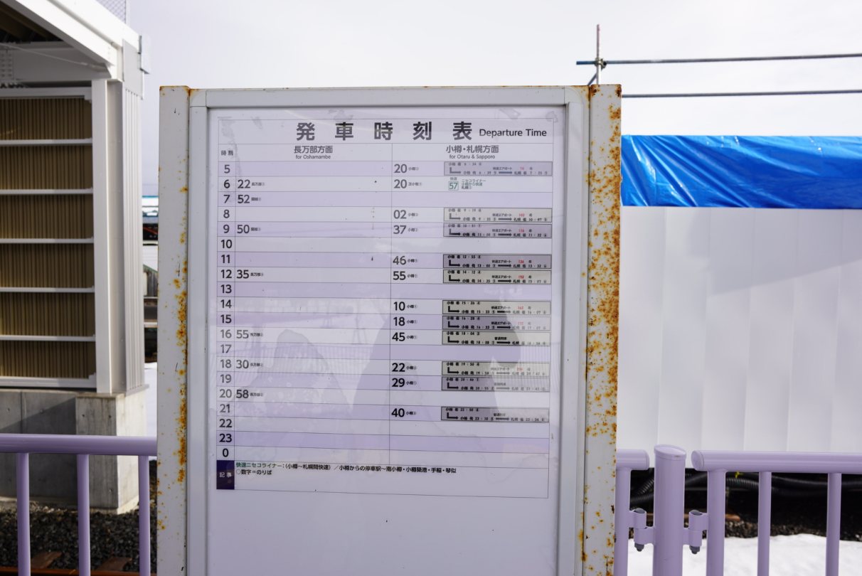 これは長万部駅発の普通列車全てです。こんな紙一枚に収まる程度の本数だけしかありません。もう周囲の小さな駅に需要はほぼ無いということでしょうか。