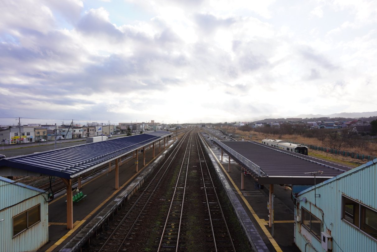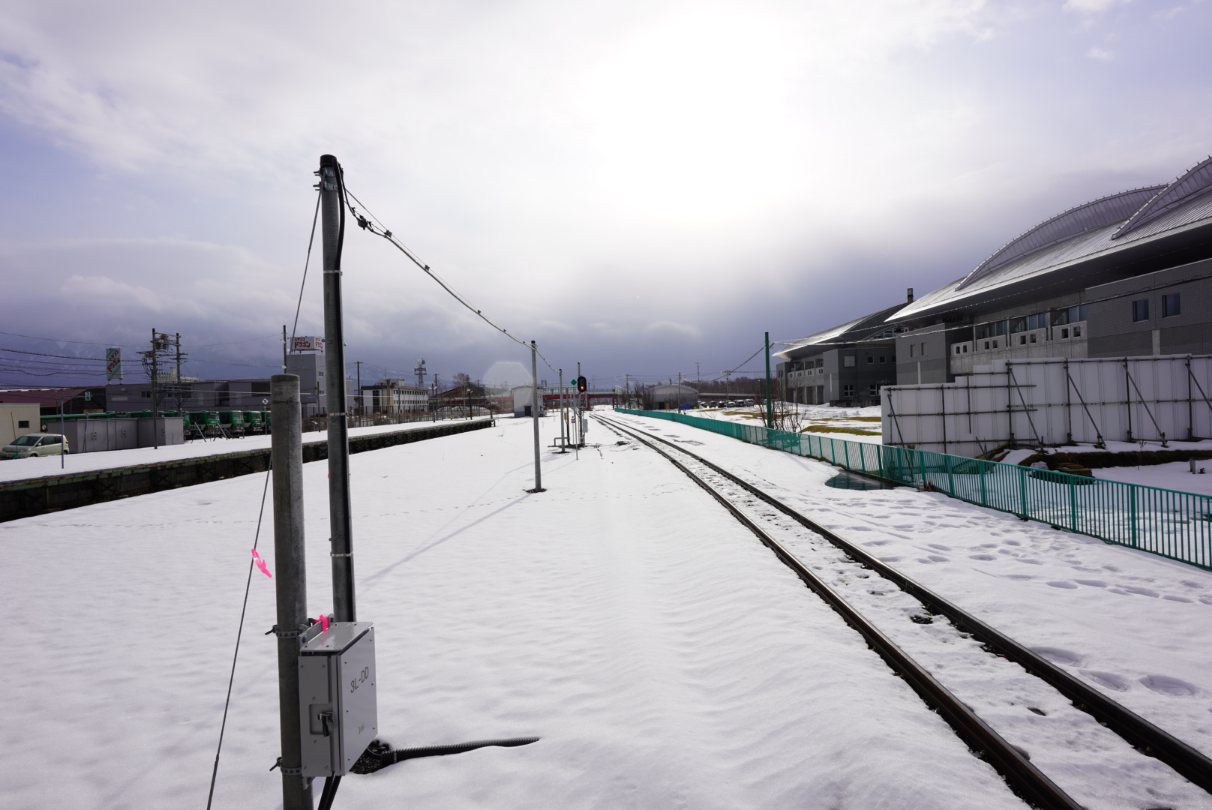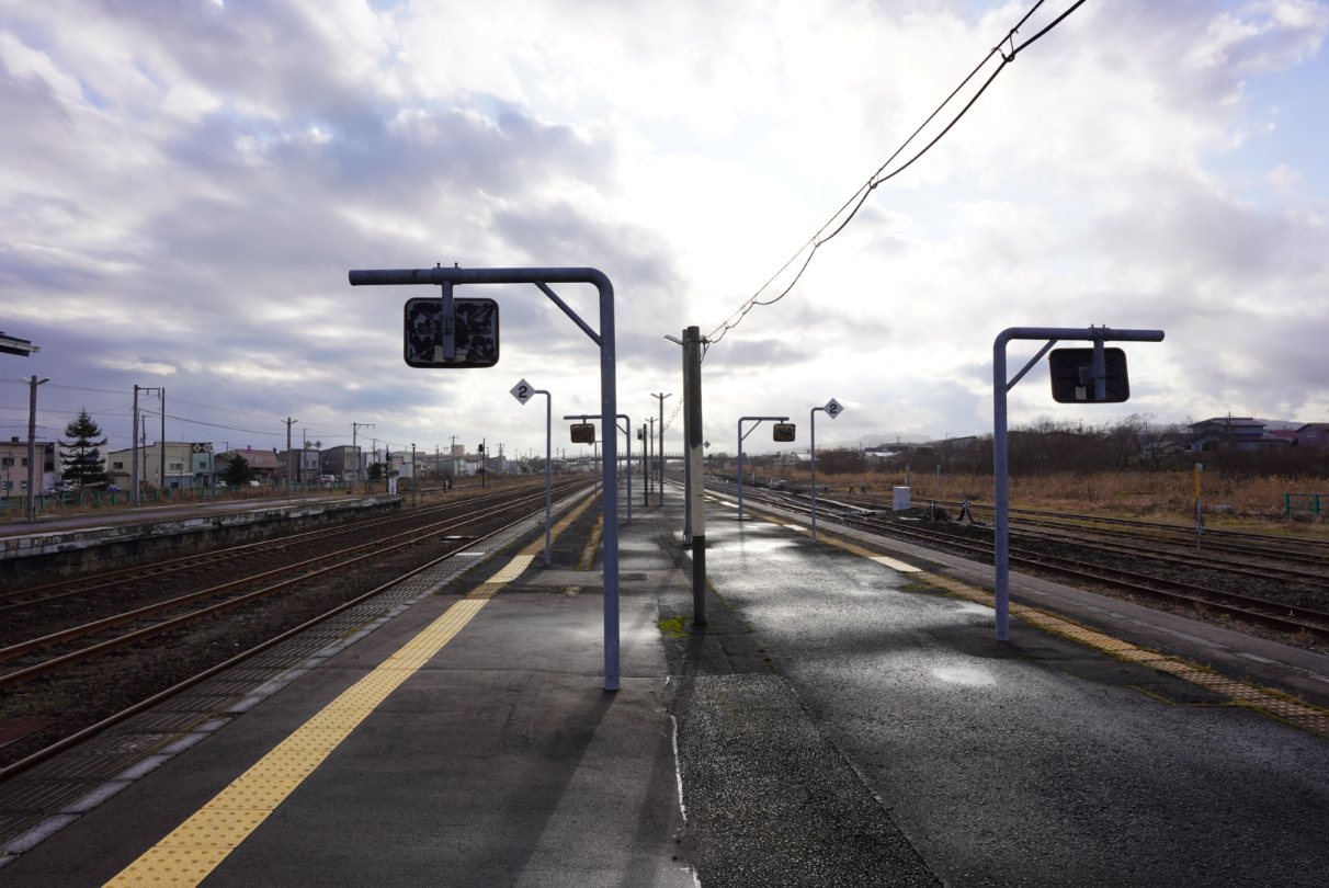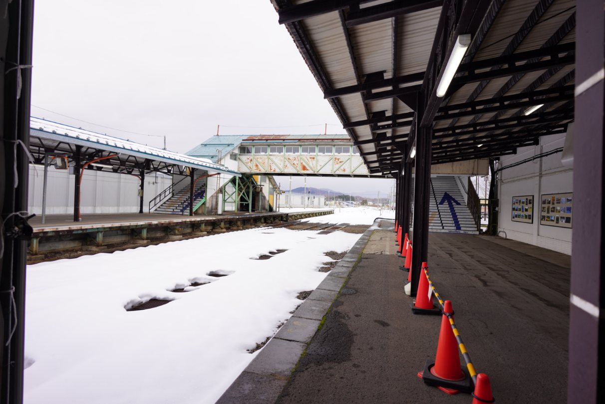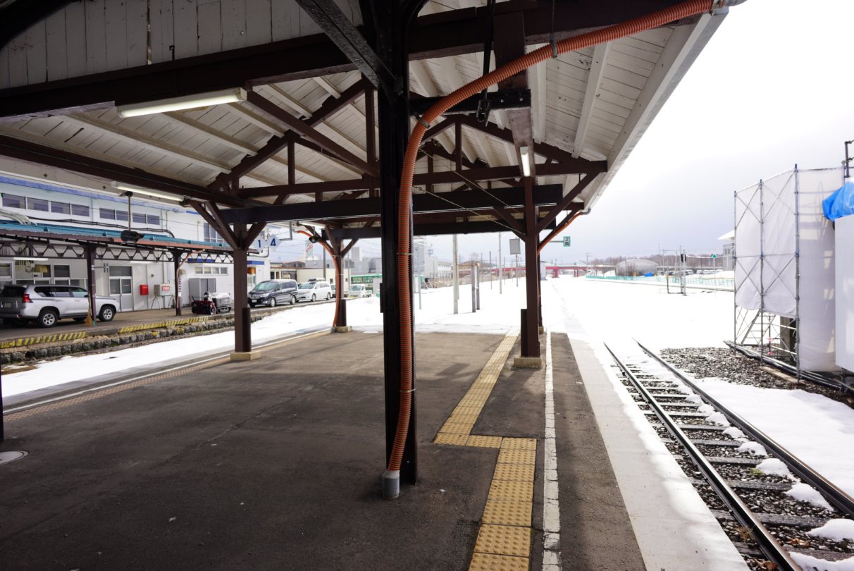 ホームからニセコ・長万部方面を望みます。ここまで来るとさすがに雪も積もって冬の北海道らしさを感じられます。