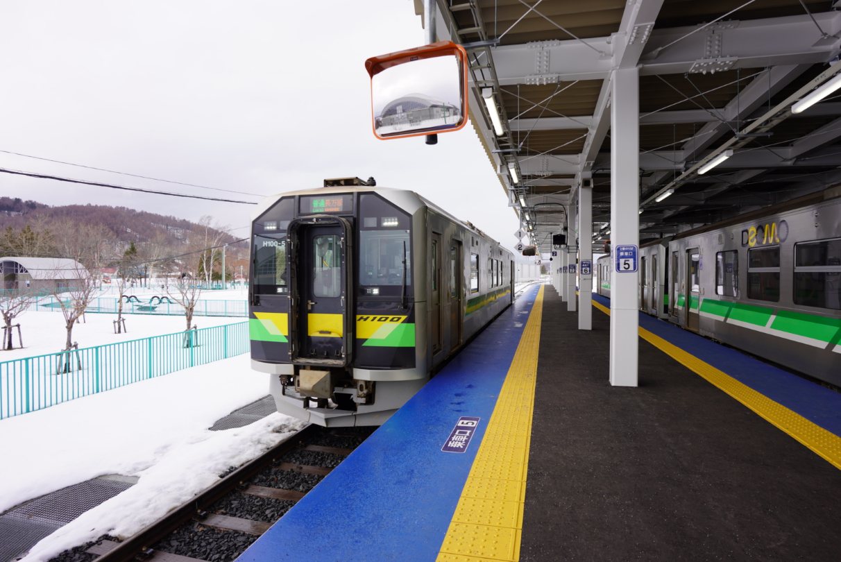 列車はJR北海道の新型気動車H100形です。JR東日本のGV-E400形の北海道仕様とも呼べる車両で、キハ40系を駆逐するために生まれたような車両となっています。