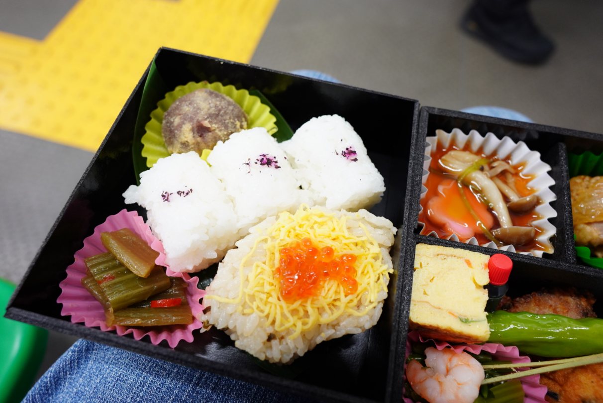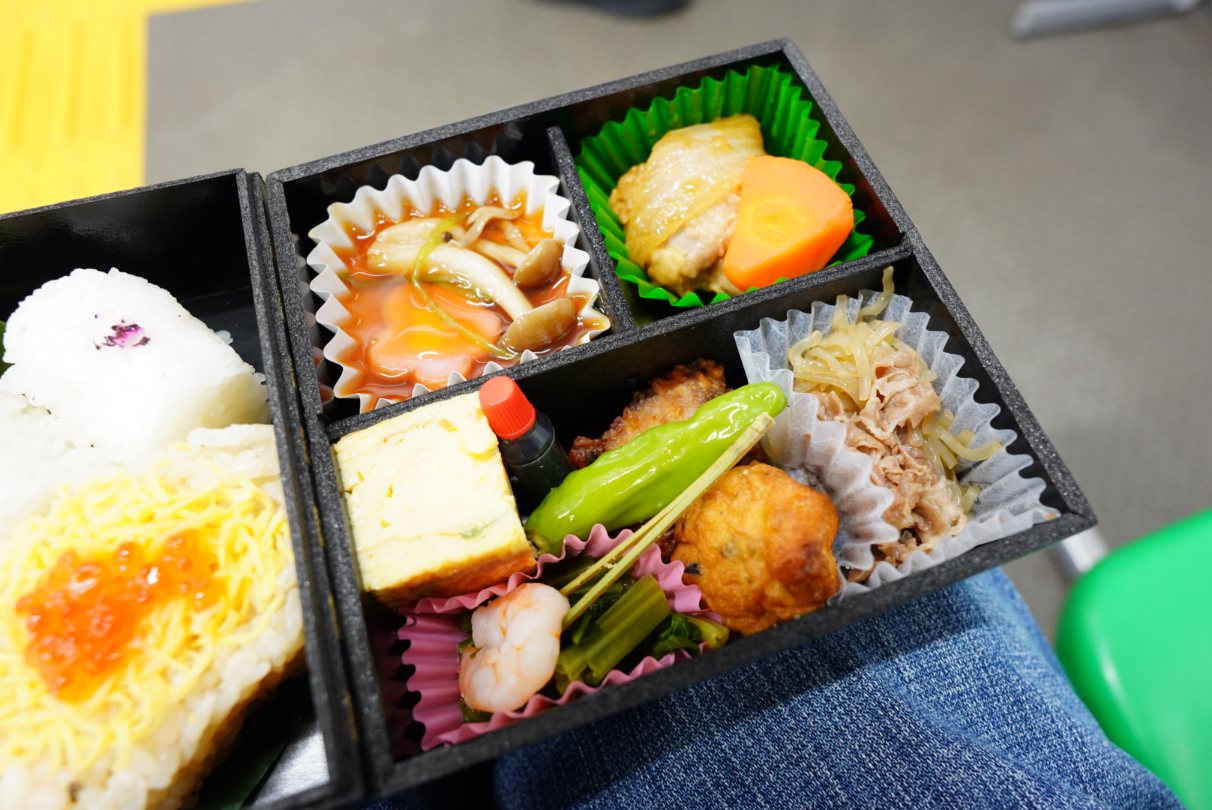 中身はこんな感じ。生の海鮮というよりは、調理済みの惣菜が多めに入っているお弁当でした。結構長い時間持ち運んだので、こういうお弁当で逆に良かったかも。