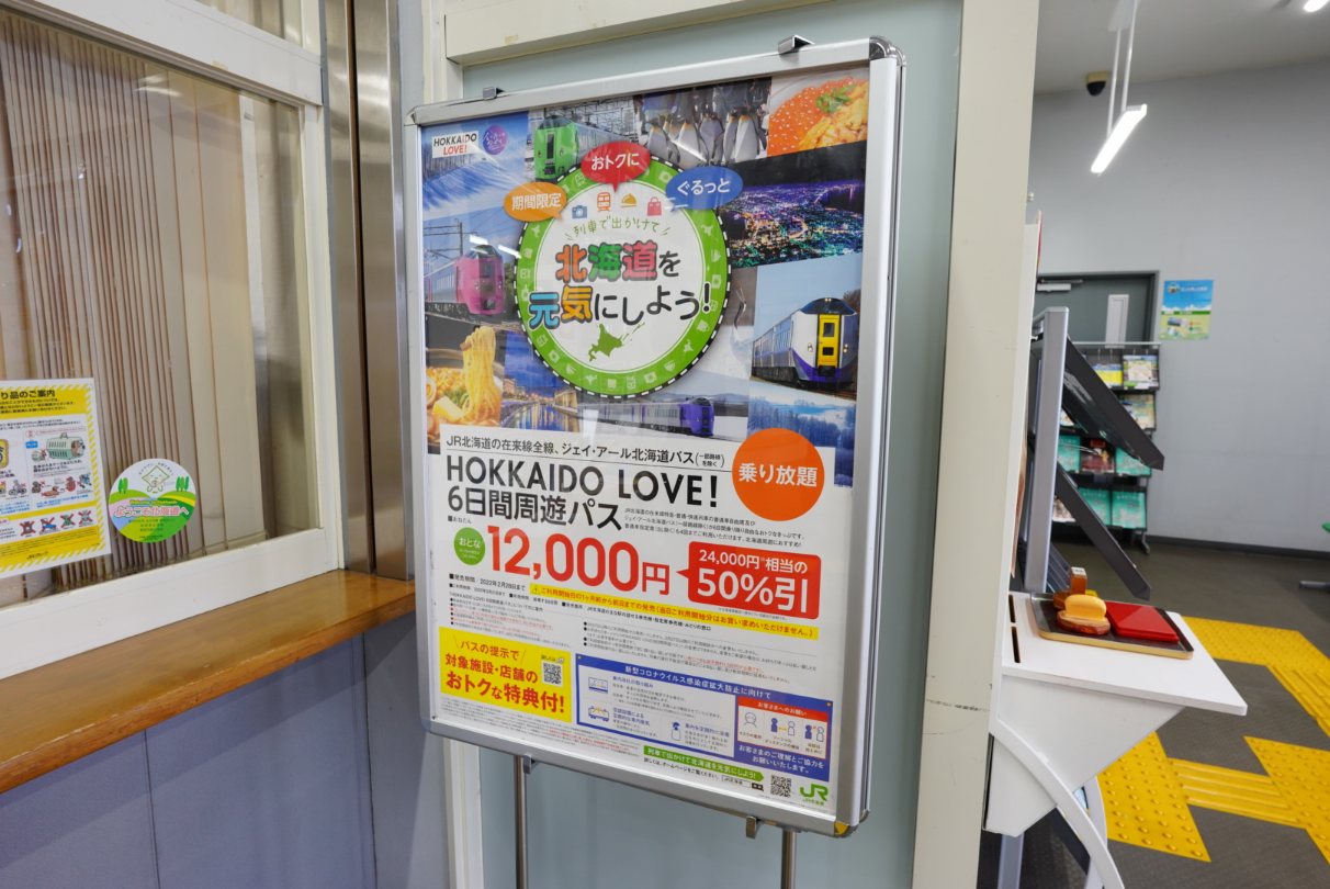 改札口には現在発売中の半額の6日間フリーパスの広告も。使ってみたい感じはあったのですが、今更乗りたい列車も無くというのが。