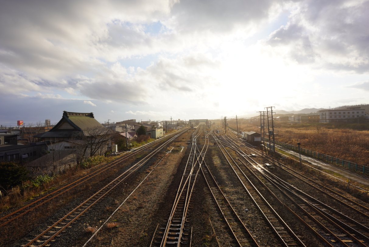 そして跨線橋の上からは線路が一望できるのですが、ちょうど函館本線と室蘭本線の分岐点を眺めることができます。夕方の日の当たり具合も合間って、ちょっと見とれて(?)しまいました。