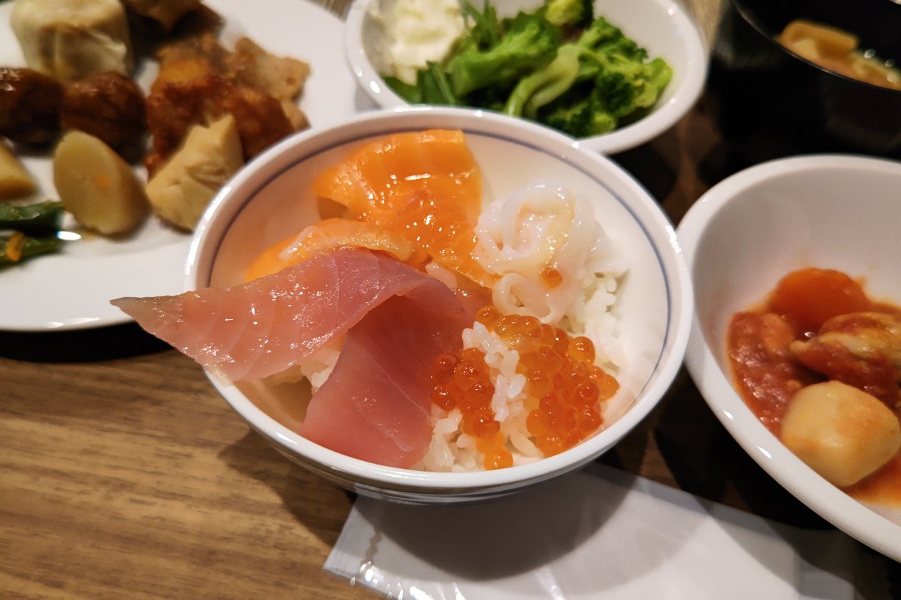 そしてニ度目の海鮮丼。今回は小鉢4つで盛って、山盛り海鮮丼ができました。こんなことをしているとあっという間に元が取れそうな感じも否めないのが北海道の朝食バイキングです。