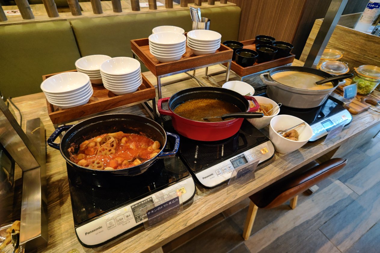 他にも筑前煮などの和食、ヨーグルトやゼリーなどのデザート、パン、シリアル、ドリンク(ドリンクバーで炭酸などもあり)と品数豊富で満足できるバイキングです。
