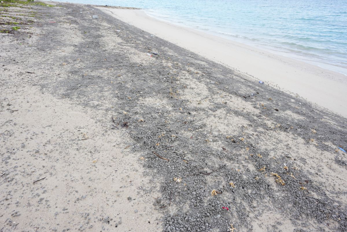 どうしても信じられないので、そこら辺に落ちていた木の枝を拾ってきて手前をほじってみると、やっぱり砂浜じゃなくて海に浮かんでいる軽石だ……。これじゃ船も出れやしないですよ。