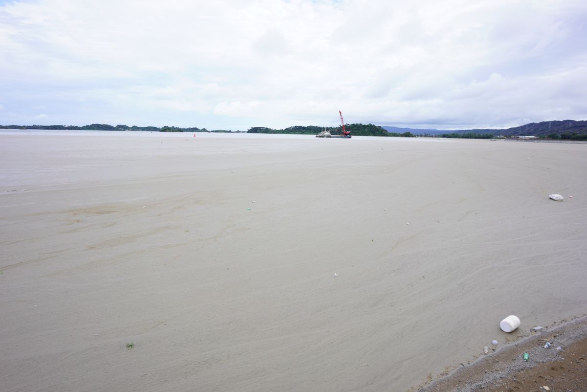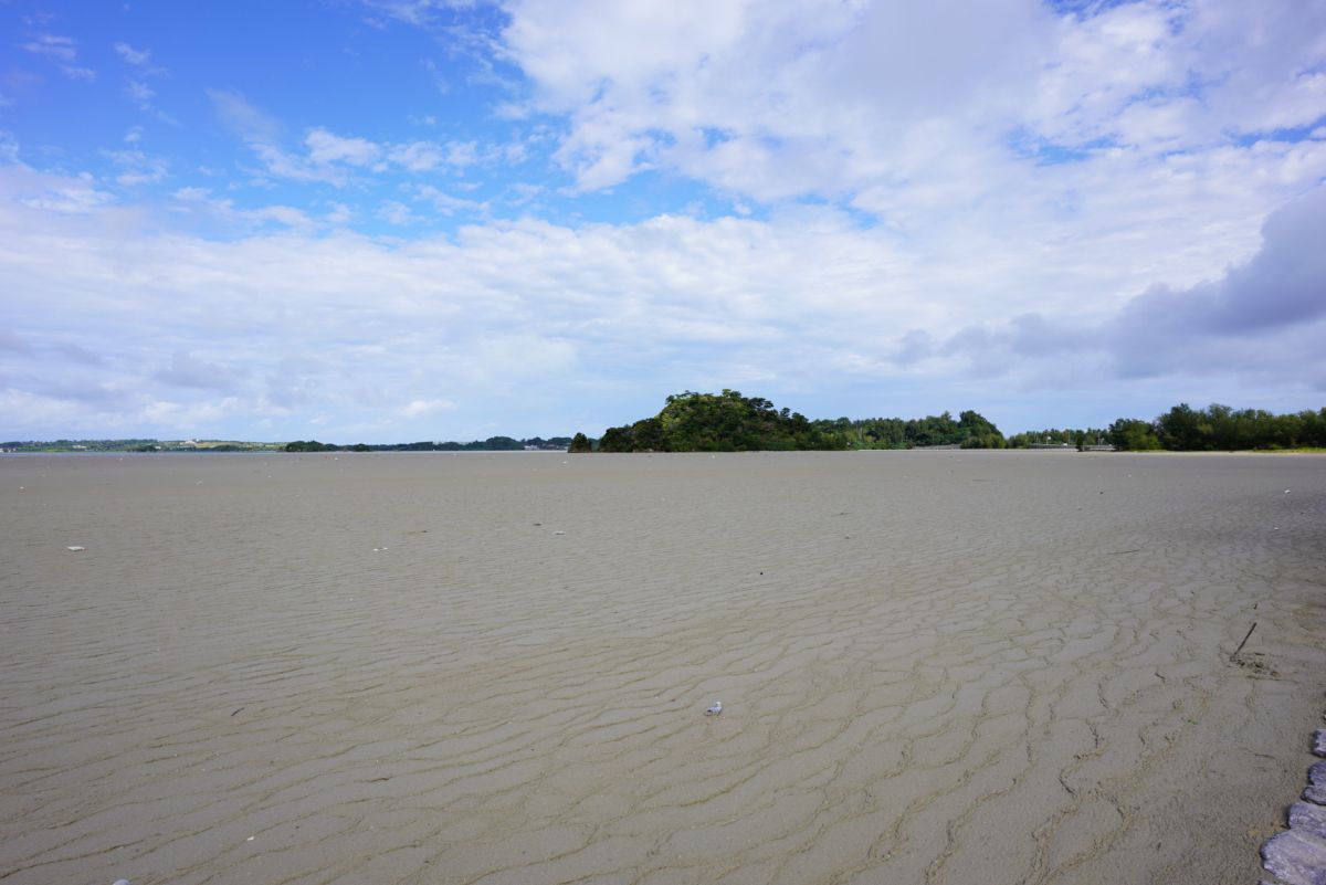 Twitterに呟いたあと、近くまで行ける場所を走っていると「いややっぱり砂浜なのでは?」と若干疑問に思ったので降りて目の前に行ってみました。こう見ると遠くまで続く砂浜にも見えるでしょ?