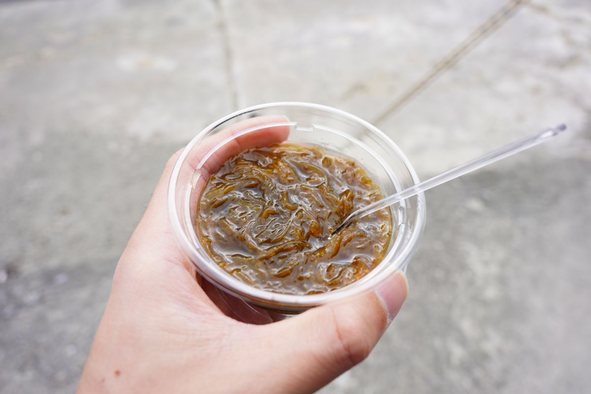 このアマミチューの墓の手前でもずくを売っていたので食べてみました。シークワーサーもずくと沖縄×沖縄というグルメ。そこら辺で取れたもずくらしいのですが、やっぱり地物は美味しいですよね。良くあるスーパーのプリンみたいなのに入ったもずくとは大違い。