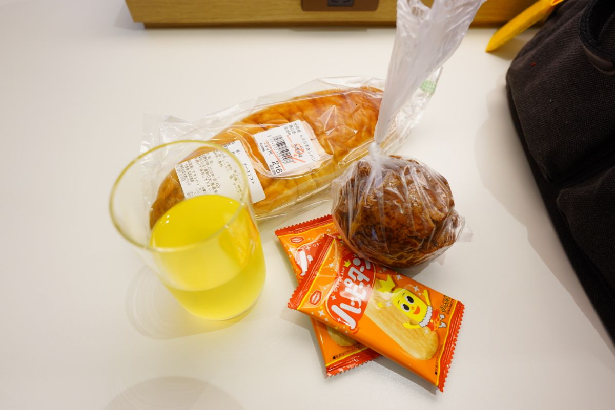 道の駅で購入したパンとサーターアンダギーなどと共に夕飯。サクララウンジはダイニングエリアなら持ち込み飲食が可能です。