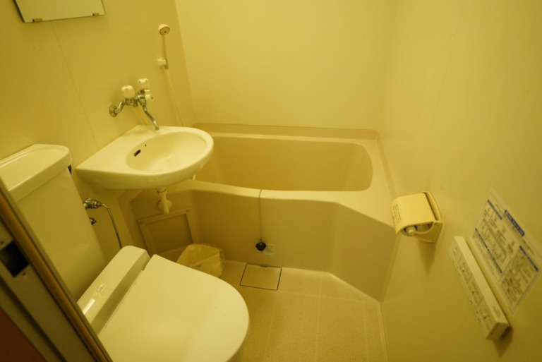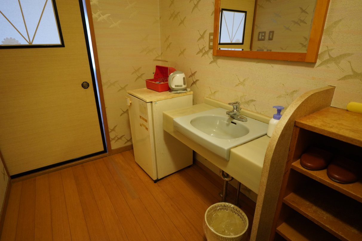 本館だったのでバストイレ付き。まあ風呂はなくても構わないんですけどね。こういう旅館では使うことはないので……。そして入口に洗面所があるのは個人的には良いポイント。