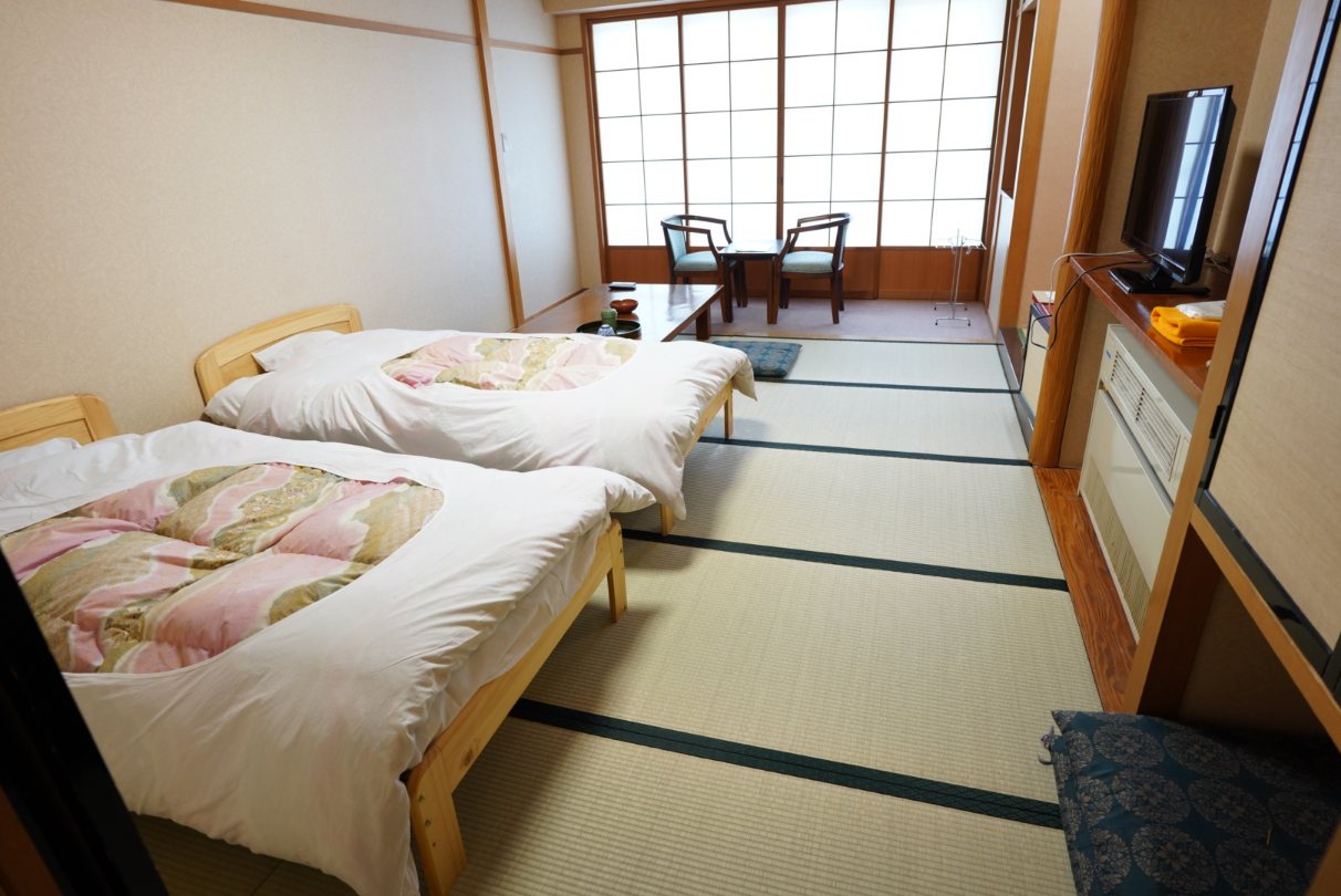 ちょっと待ってチェックイン&部屋に入室。1人で泊まるにしては広すぎる部屋となりました。そして和室だけどベッドというのはおおるりあるあるらしい。