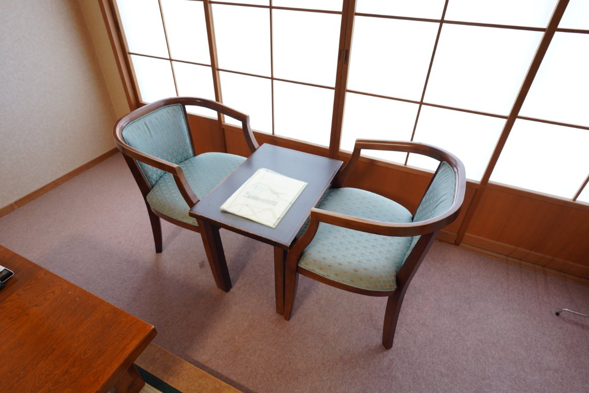 奥にはゆっくり座って過ごせる温泉旅館によくあるスペースも。では窓を開けてみましょう。