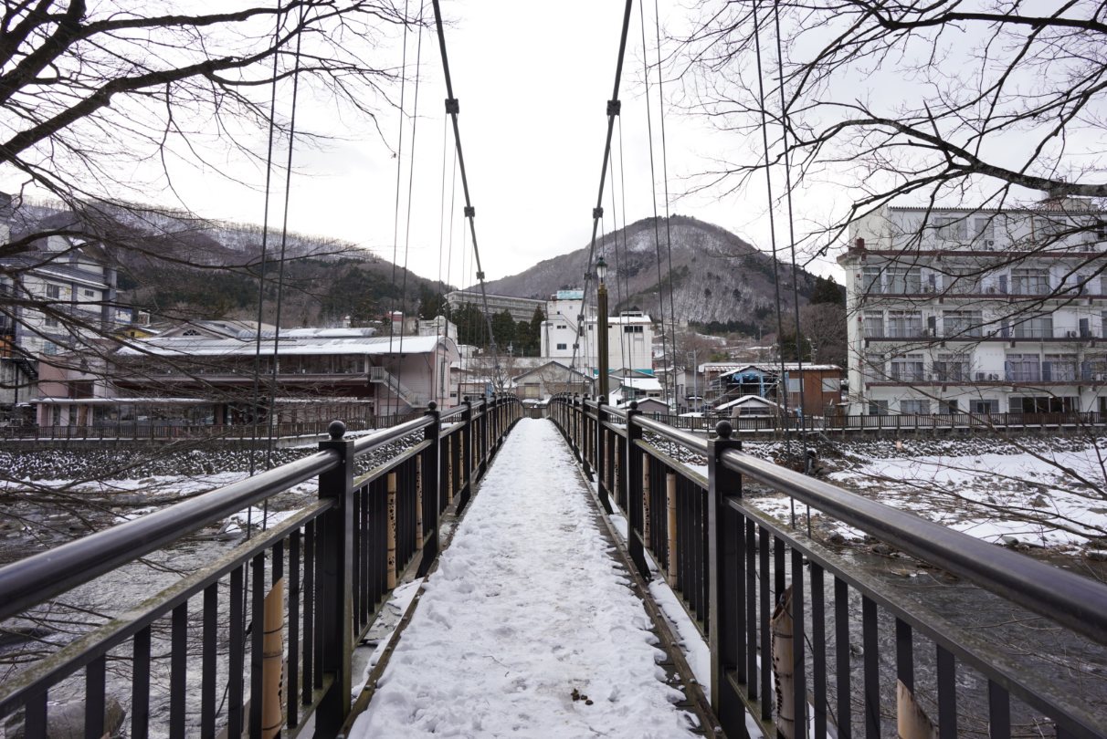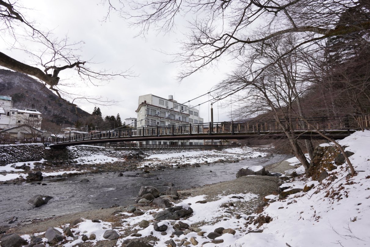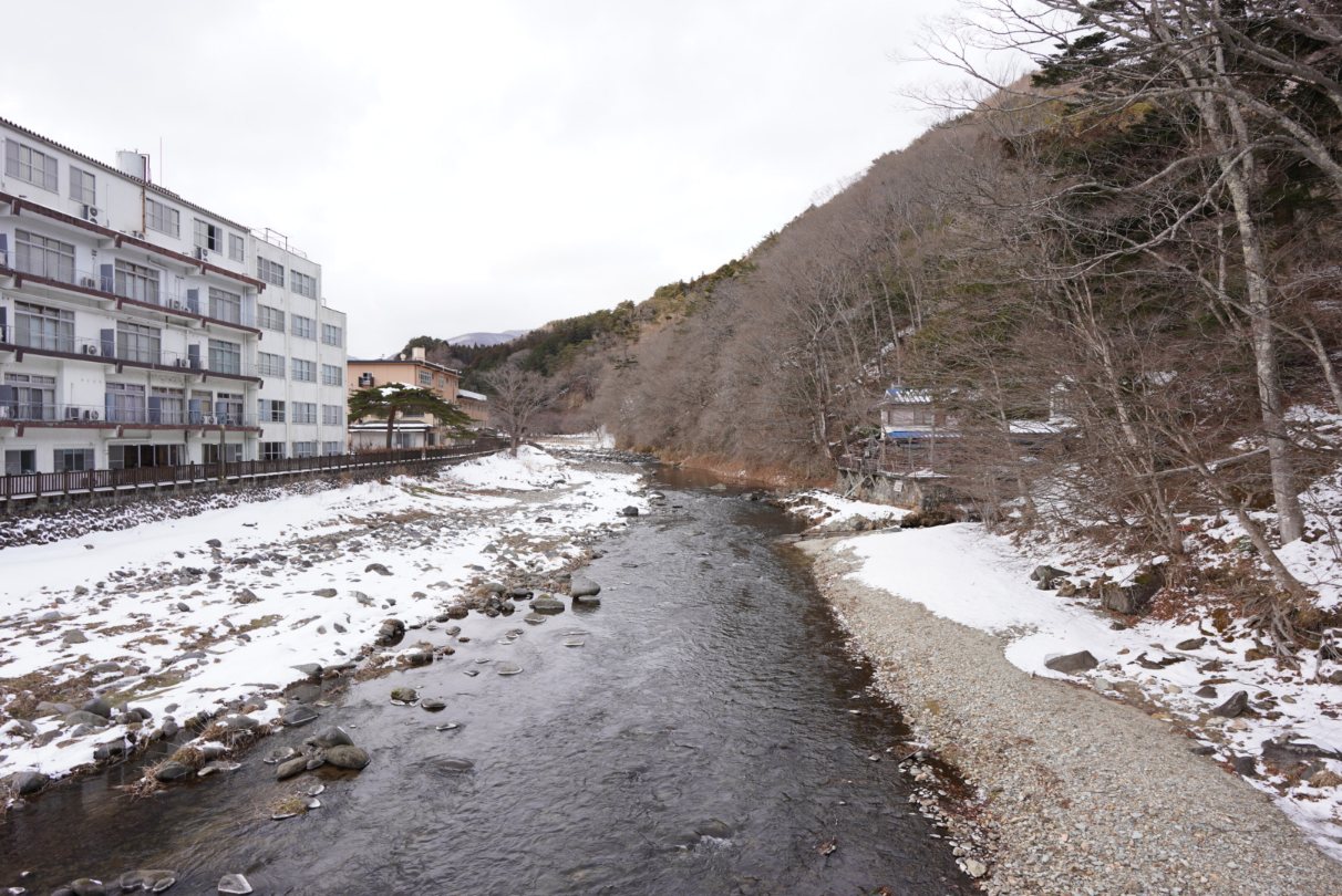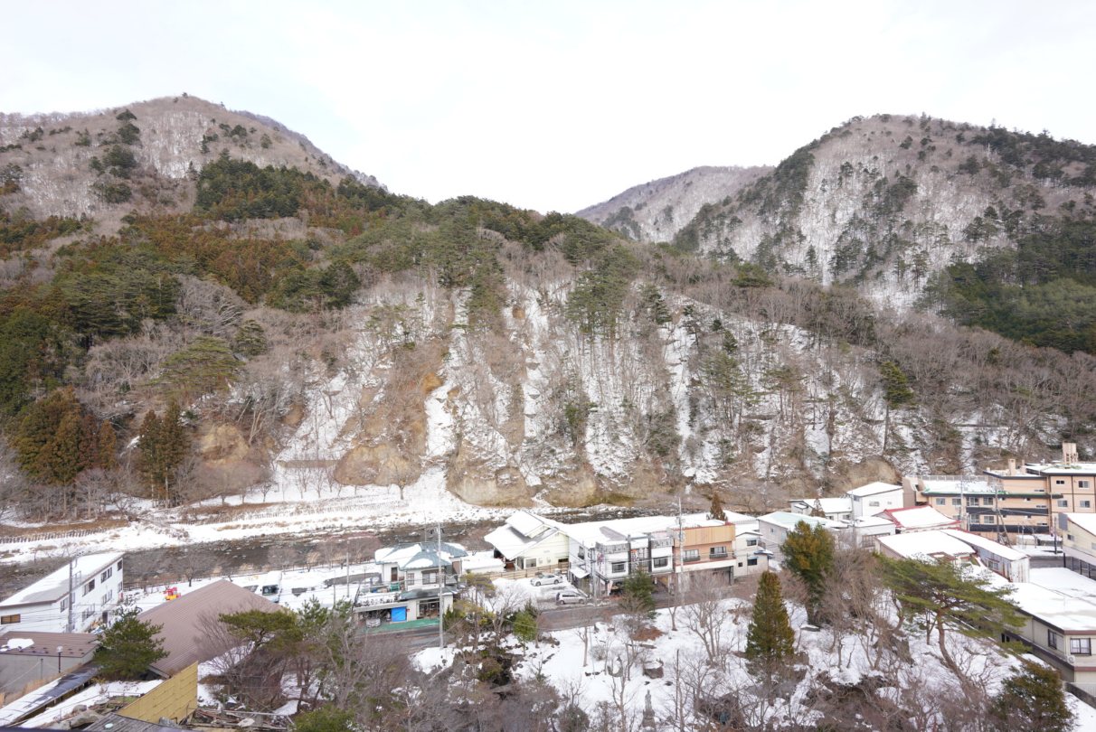 窓を開けると雪景色の山&川が見えて良い景色。大型ホテルばっかりの鬼怒川温泉よりもこういう自然が見える温泉街って良いですよね。ここまで栃木駅から無料送迎してくれるなら鬼怒川温泉とかよりこっちのほうが良いよなぁ。草津は混みすぎだし。