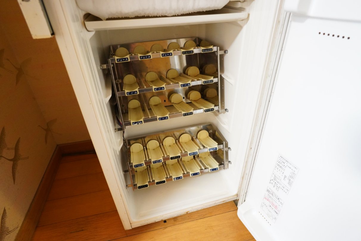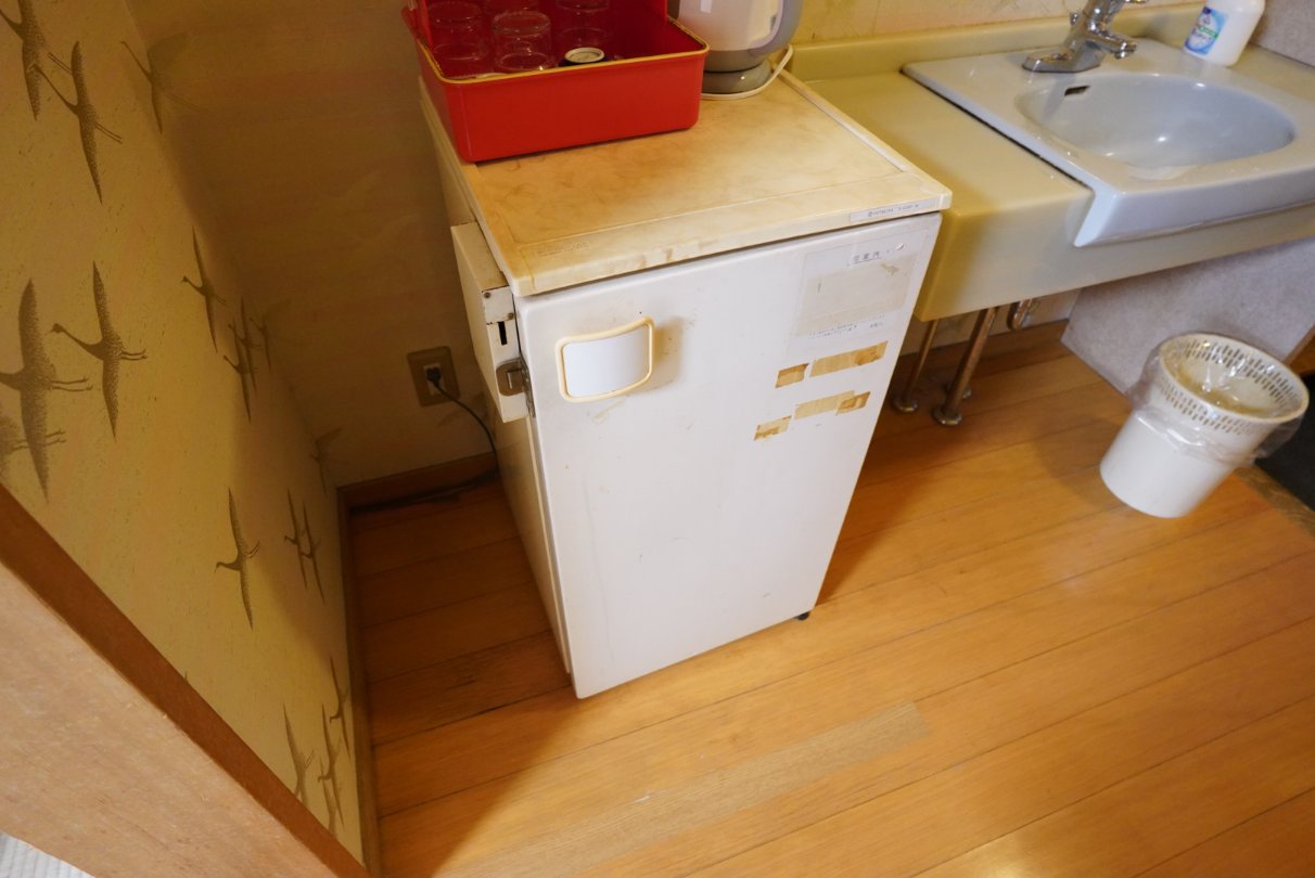 冷蔵庫は昔の旅館にあった自動販売機式の冷蔵庫。今では空っぽになっているのですが、仕切りが邪魔なので大きなものが入らないのはネックです。