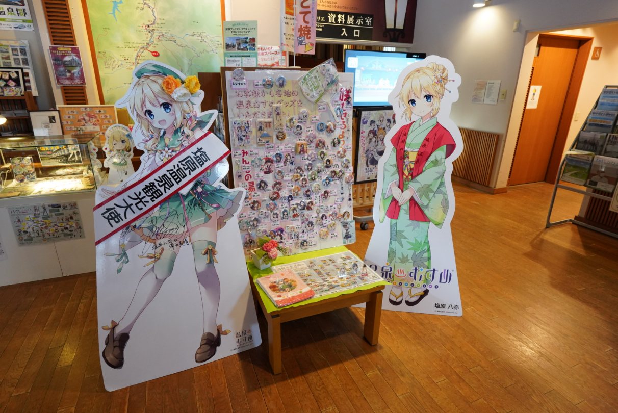 塩原ものがたり館ではお土産品の他、塩原温泉の温泉むすめの「塩原八弥」ちゃん の看板があったりグッズの販売もしています。かわいいんだよなぁ塩原八弥ちゃん……。アクキーでも買っていこうかしら。