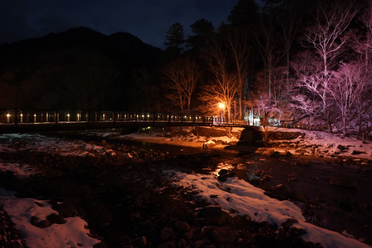 逆にきれいだなぁと思ったのは川岸の雪が被った木のライトアップ。自然とのコラボという都会ではなかなかできないここならではのイルミネーションでした。