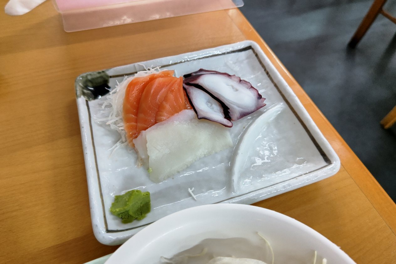 こちらは刺身3点盛り。案外サーモンとイカが美味しかった。これは悪くないと思う。