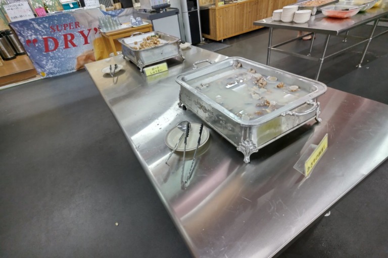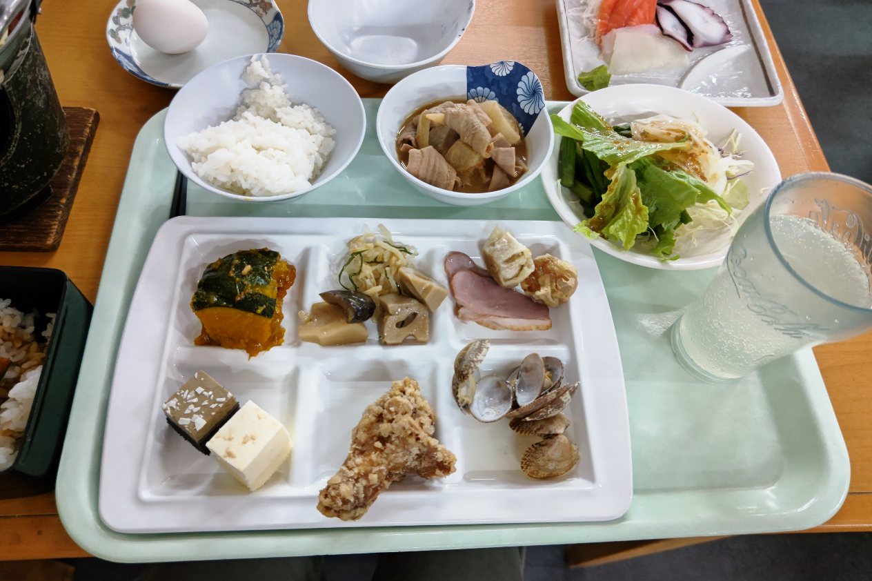 おおるりの食事はメインディッシュ+バイキングというスタイル。お盆に乗っているのがバイキングの品です。メニューとしては左上からすき焼き、刺身、うな重、白米、もつ煮、サラダ、かぼちゃの煮物、筑前煮、合鴨、ポークシュウマイ、ケーキ、から揚げ(骨付き)、アサリの酒蒸しというラインナップ。伊東園ホテルは「家族連れ向け」という感じでしたが、こっちのバイキングは酒のツマミって雰囲気が大きいです。