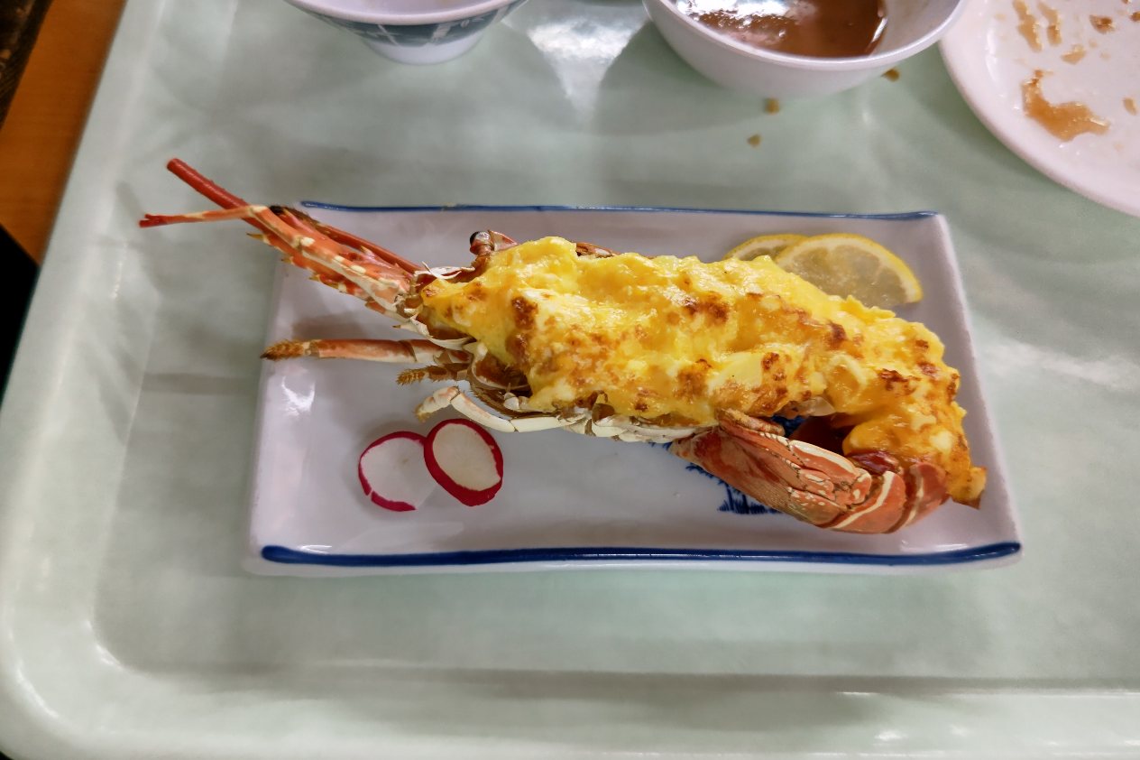 後からやってきたロブスターの黄金焼き。まあたまごとグラタンソースみたいなのが上に掛かっているのですが……。まあエビです。個人的にはこれはまだ冷めてもいいからうな重を温かい状態で食べたかった。