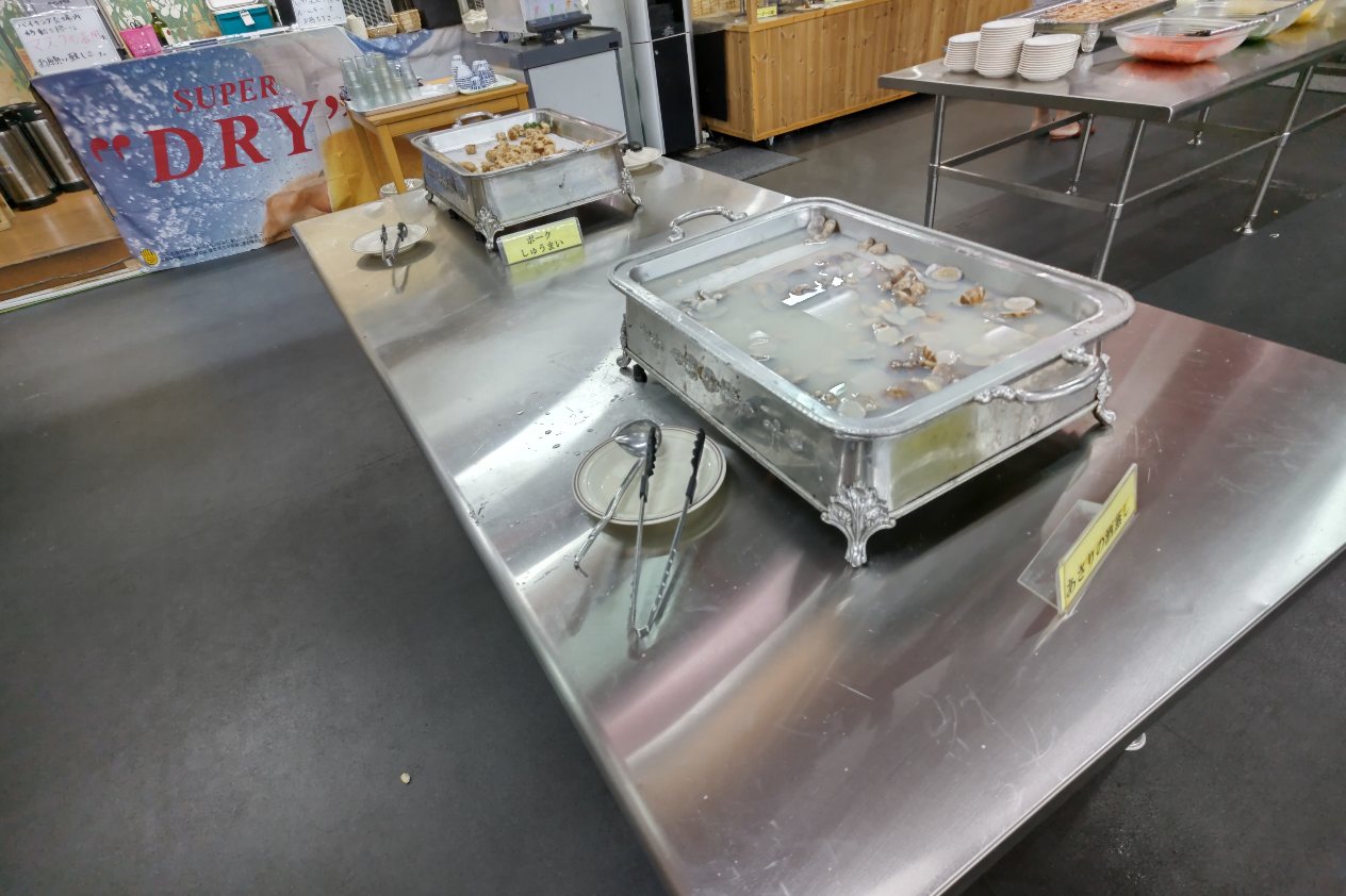 ホテルおおるりの夕食は17時半から19時まで。全員固定です。遅れたら食べる時間やバイキングの品が無くなるだけだし、17時半にはもう各机に品が置いてあるので遅くなると乾燥します。