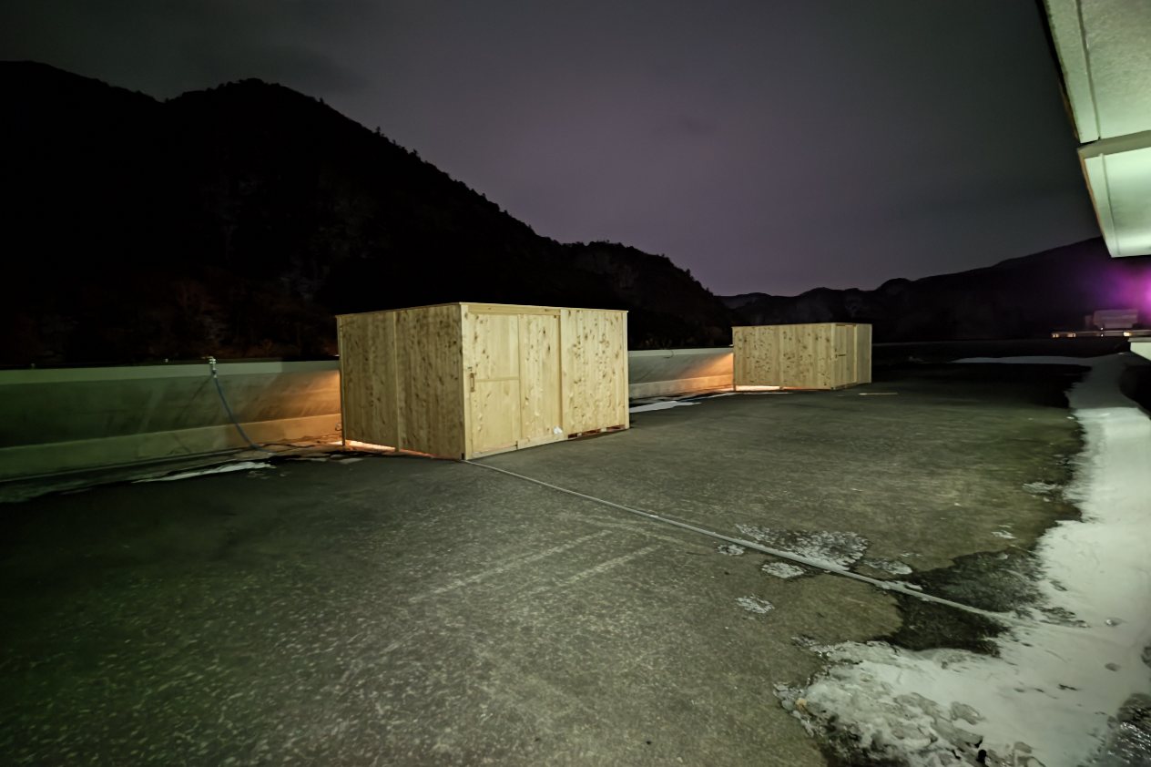 屋上に上がるととてもシュールな光景が。木の小屋が2つあって、今回は左側の貸切です。