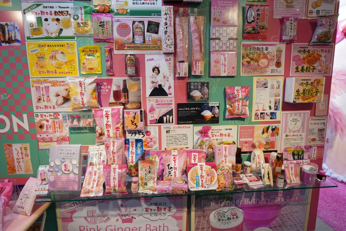 お土産コーナーや食事コーナーも有りますが、まずは展示コーナーへ。販売中の新生姜関連の商品がずらっと並んでいました。