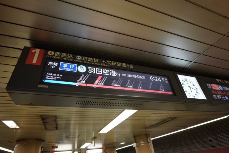 日中は快特ばかりになって運行されていない都営浅草線からのエアポート急行の羽田空港行き。結構止まる印象ですが、羽田空港までの所要時間は10分位しか差がありません。