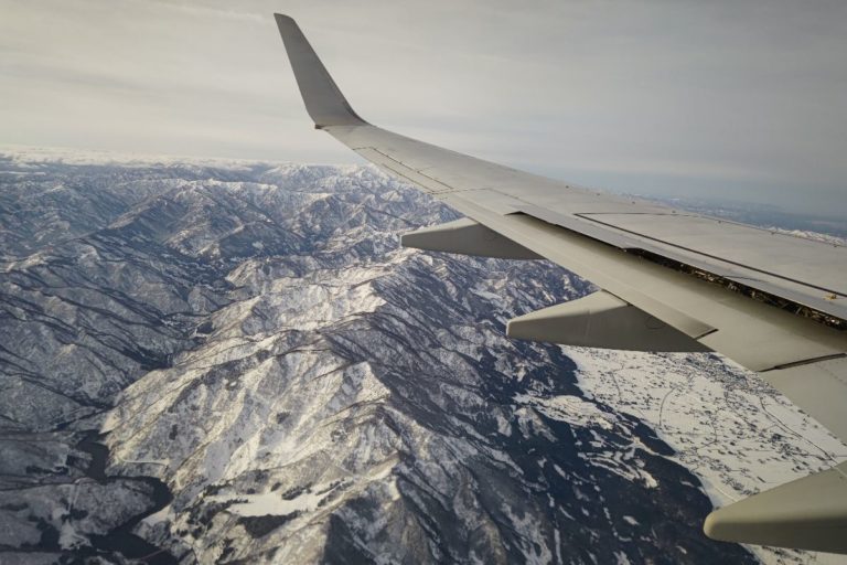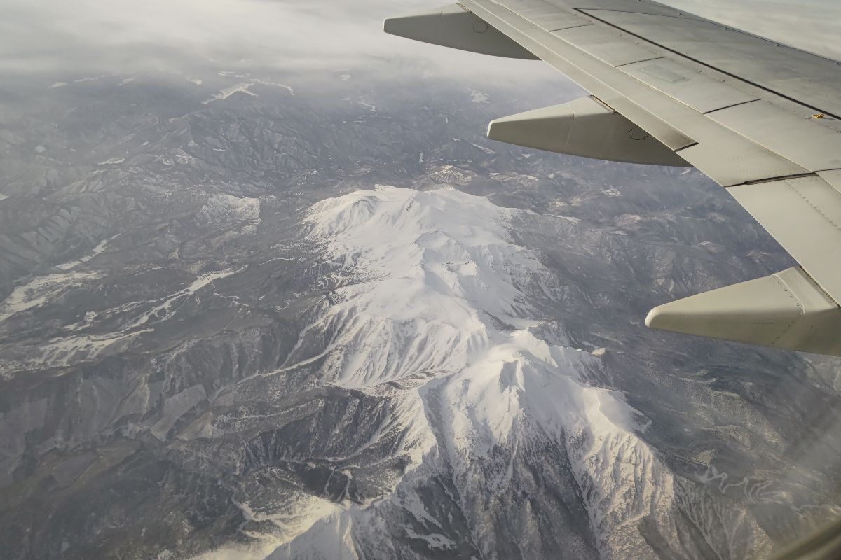 小松着陸の少し前には綺麗な雪山を望むことができました。北陸はアルプスとかありますし山が綺麗ですよね。