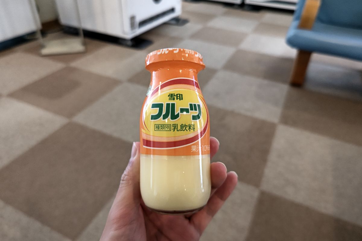 湯上がりにはフルーツ牛乳。これは美味しいんですよ。瓶で飲むのが風呂上がりの鉄則ですね(?)
