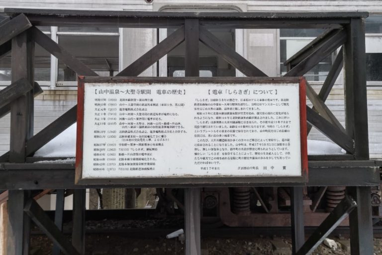 看板があったので見てみると、以前山中温泉に通っていた北陸鉄道という路線で走っていた列車のようです。廃線後に大井川鐵道にて走っていましたが、ここに戻ってきたという流れで保存されています。