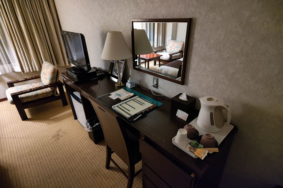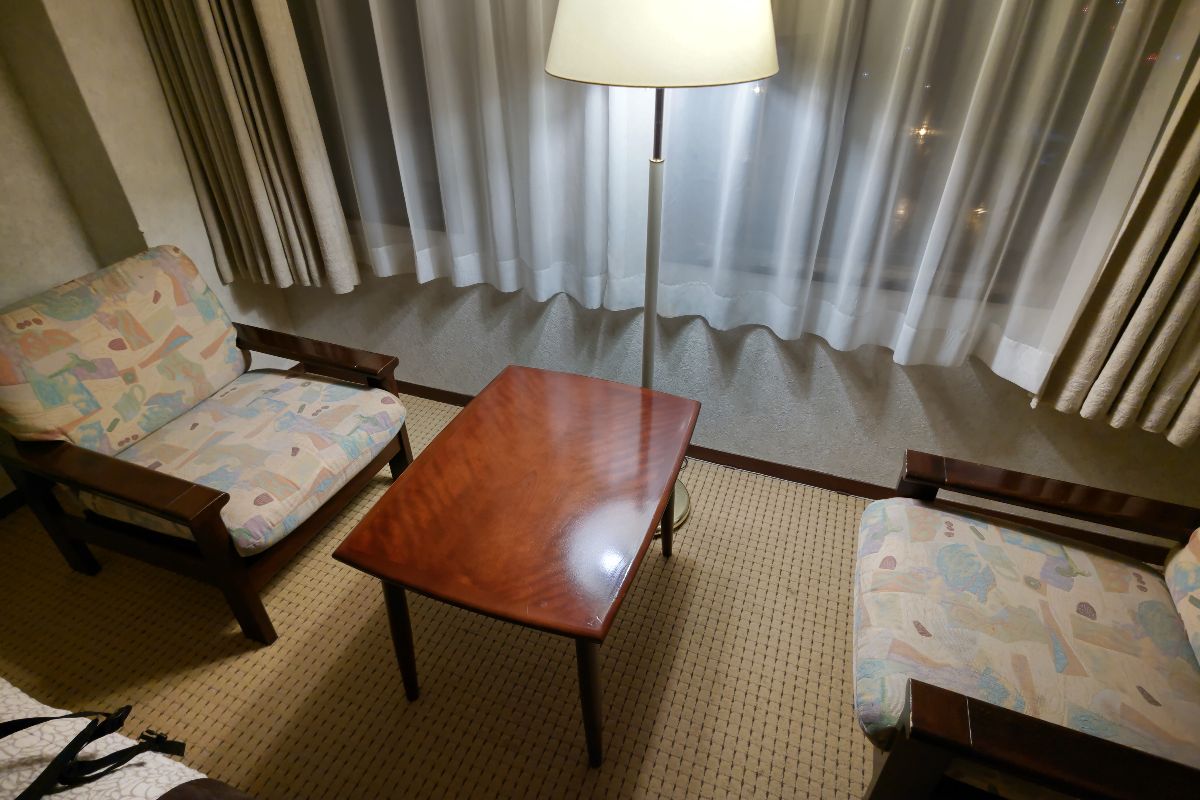 ちょっと写真が暗くなってしまいましたが部屋はこんな感じで広々としています。高い階だったのと、山の上に建っているので夜景が結構綺麗に見えるのも良いポイント。
