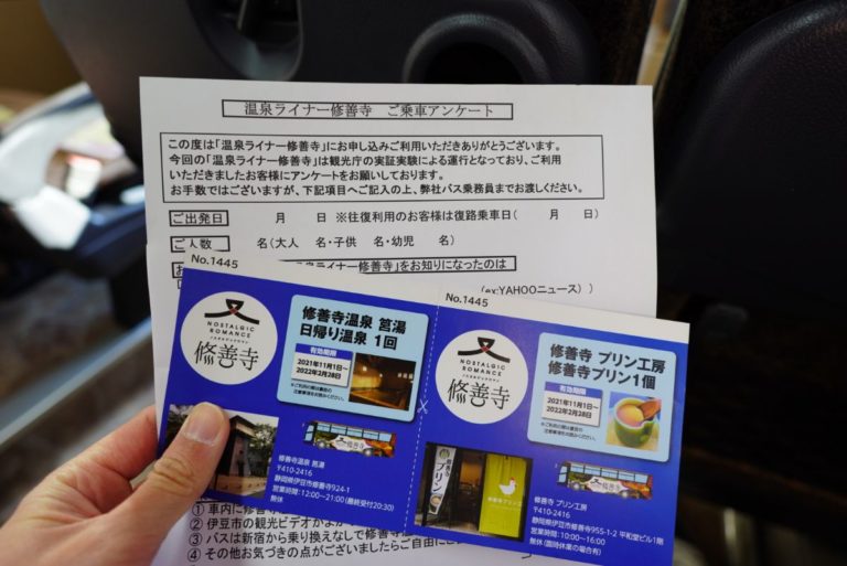 そしてモニターのアンケートと乗車特典の日帰り温泉とプリン無料券。しかし個人的には修善寺温泉に行ってどうせ温泉宿に泊まるんだから、日帰り温泉よりもランチのクーポン券とかのが良かったかも。