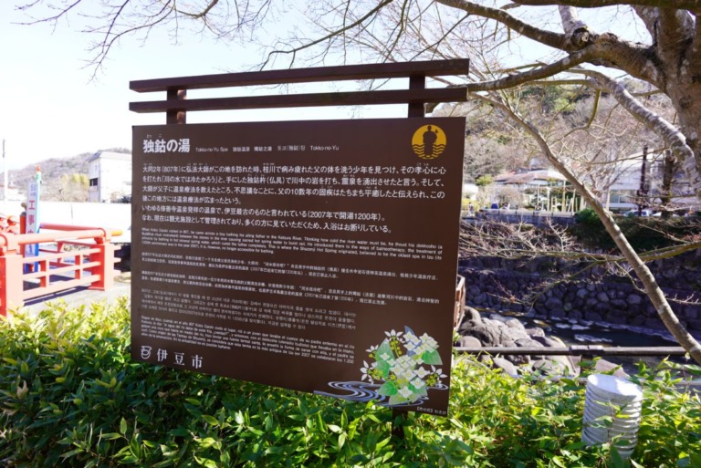 中心部に向かって歩いていると、独鈷の湯という看板が見えてきました。川の真ん中に温泉があったのですが、説明書きを見るとあくまで見るための温泉に現状はなっているようで、景観は良いのに残念だなぁと少し思います。
