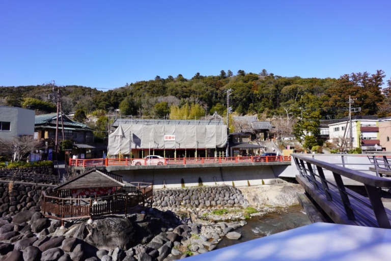 足湯に入りながらの景色はこんな感じ。桂川と修善寺を眺めながらゆっくり足を温めることができます。向かいの商店が工事中なのが残念でしたね。