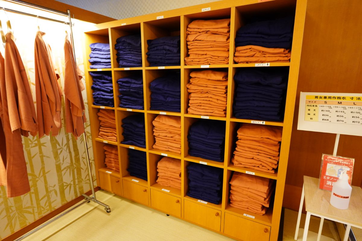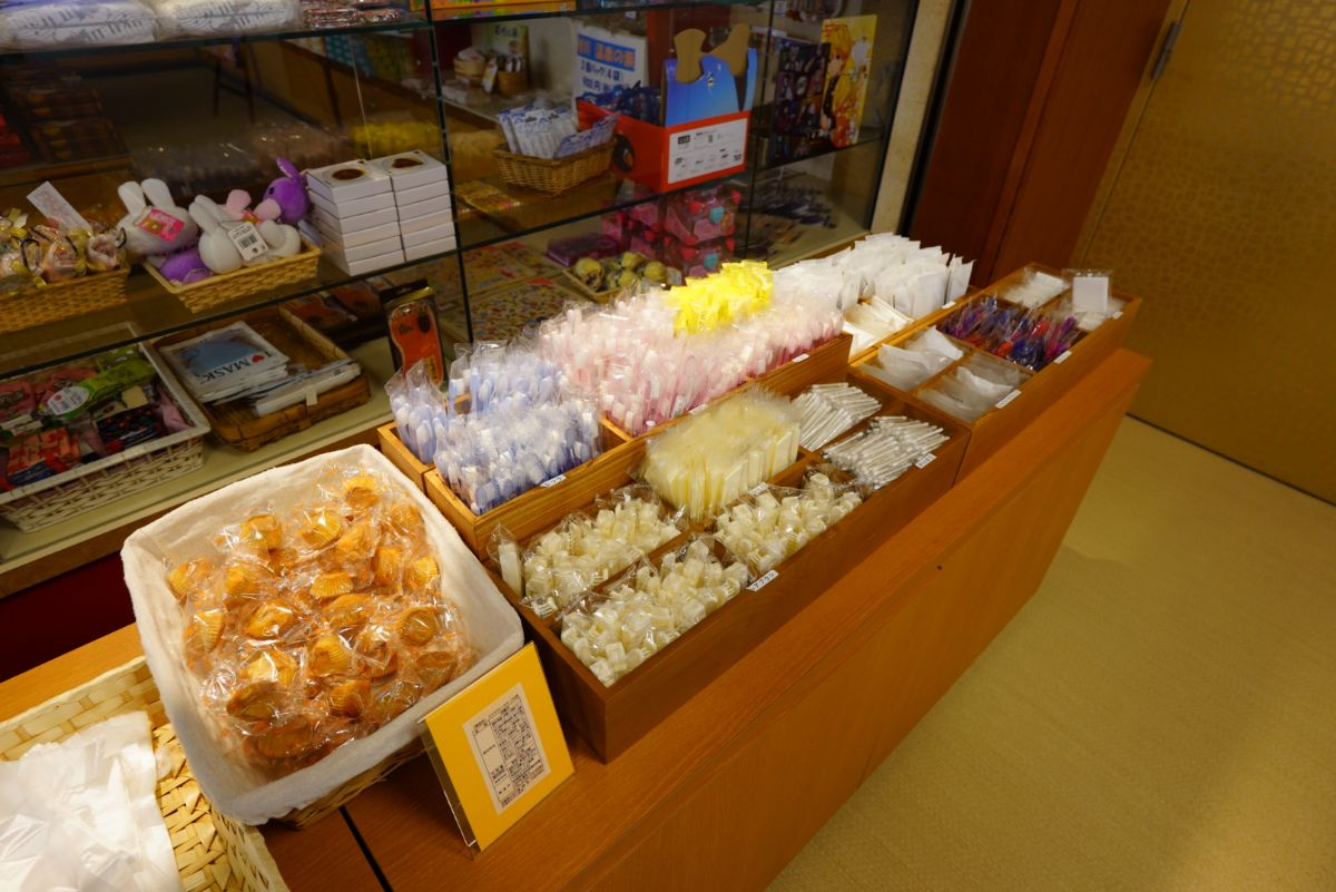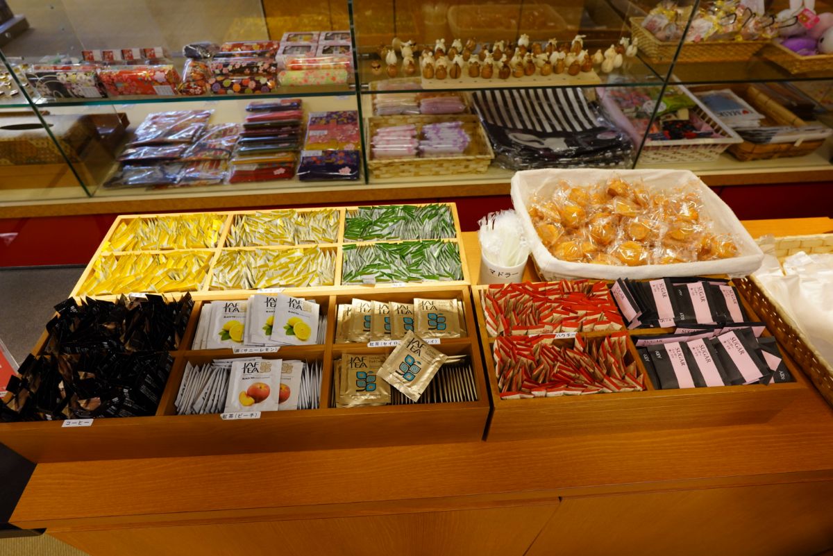 チェックインを済ませて部屋に向かう前に、館内着やアメニティを回収していきます。ここでは部屋にアメニティの配備はなく、必要な人が必要な量持っていくスタイルです。正直ほとんど使わないので、このスタイルで良いと思います。そういえばお茶請けの代わりに小さなケーキなんですね。