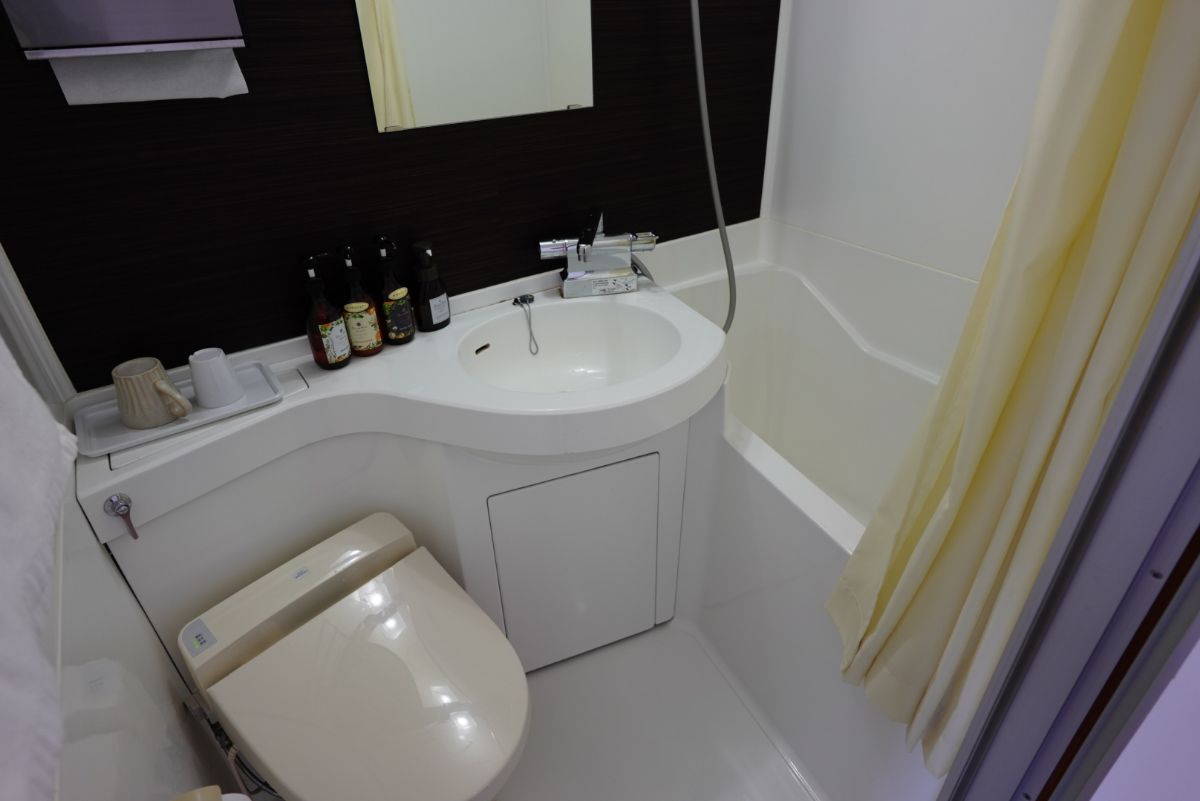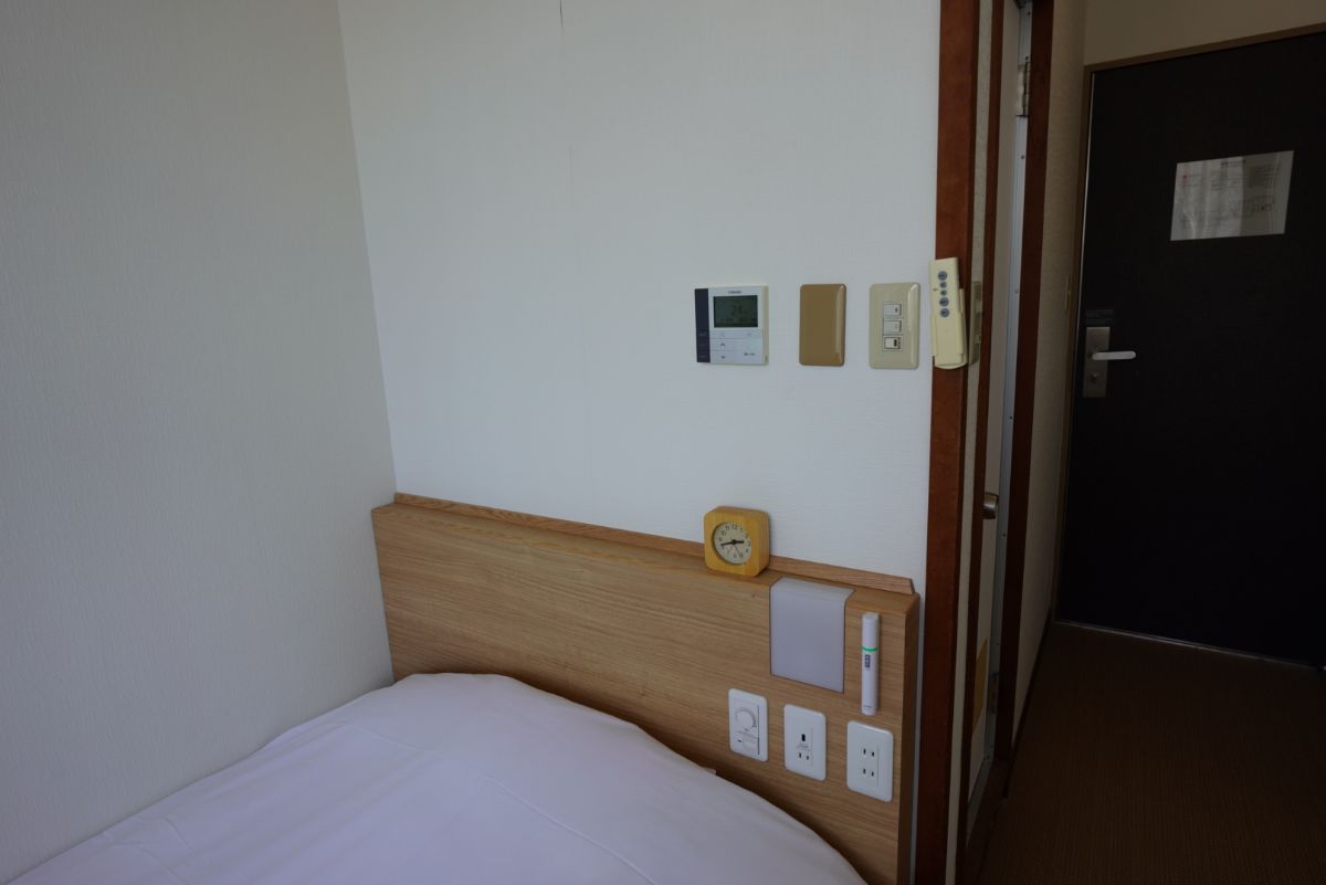 ベッドの脇にはコンセントやUSBなどの設備があるほか、一応バス・トイレの設備は揃っています。とはいえここに泊まって温泉入らないこともないですし、設備はなくてもいいと思うレベル。