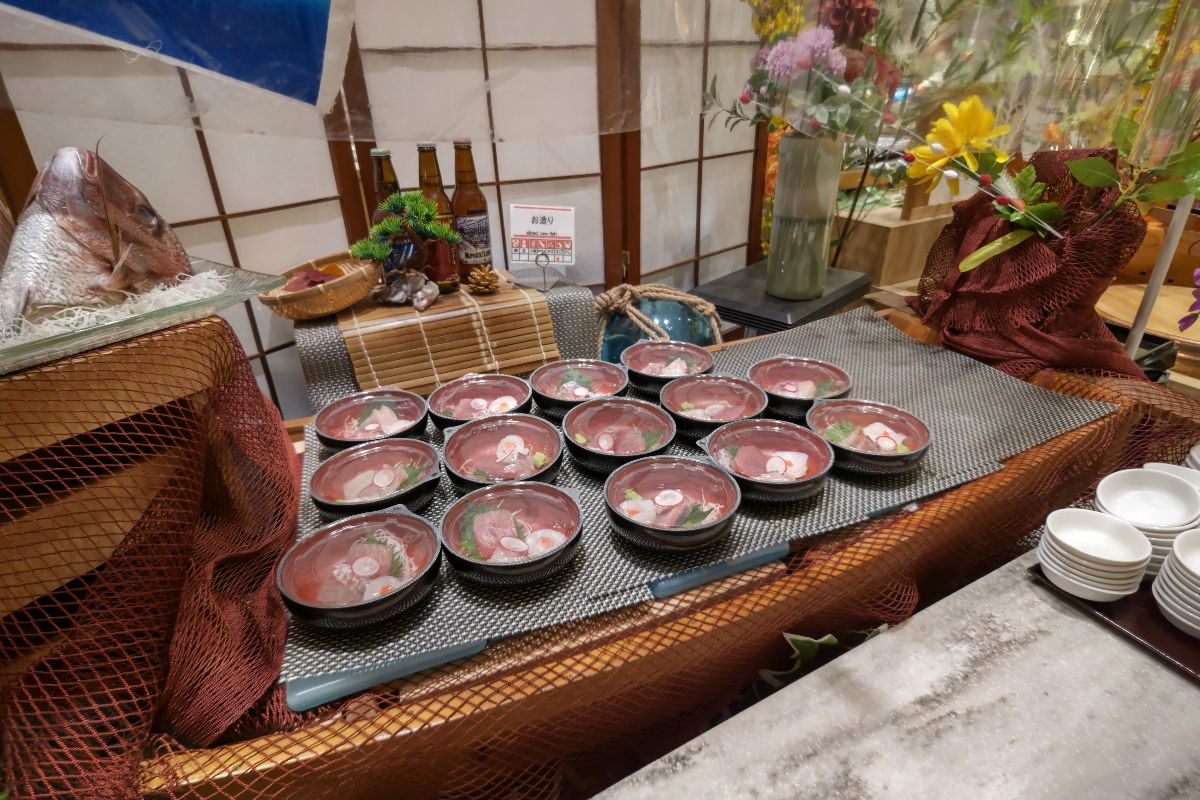 美味しいグルメが並ぶビュッフェスタイルの夕食