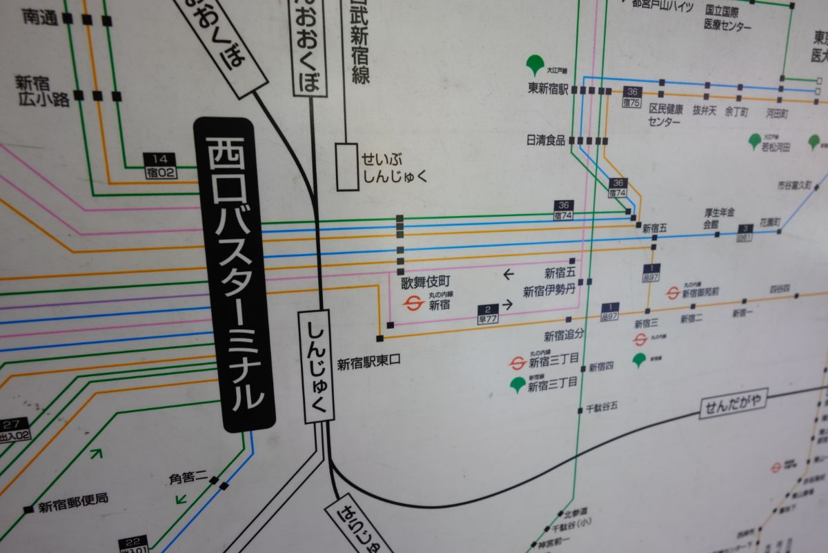 良くこういう表記が古い看板でも、新規にできた路線が上から書いてある場合もあるのですが、これは全く追記されておらず、副都心線もなければ、大江戸線も記載されていません。同じ東京都交通局くらいは記載しては良いのでは……。