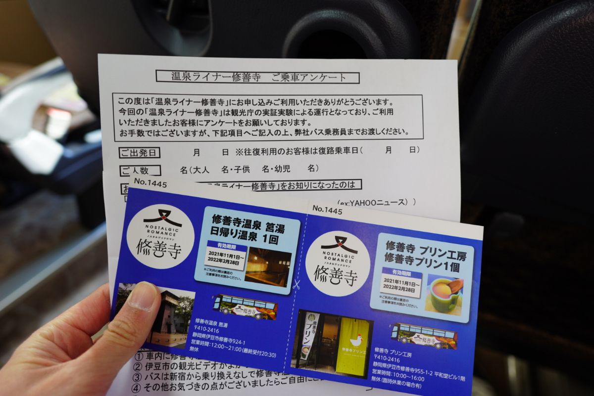 そしてモニターのアンケートと乗車特典の日帰り温泉とプリン無料券。しかし個人的には修善寺温泉に行ってどうせ温泉宿に泊まるんだから、日帰り温泉よりもランチのクーポン券とかのが良かったかも。