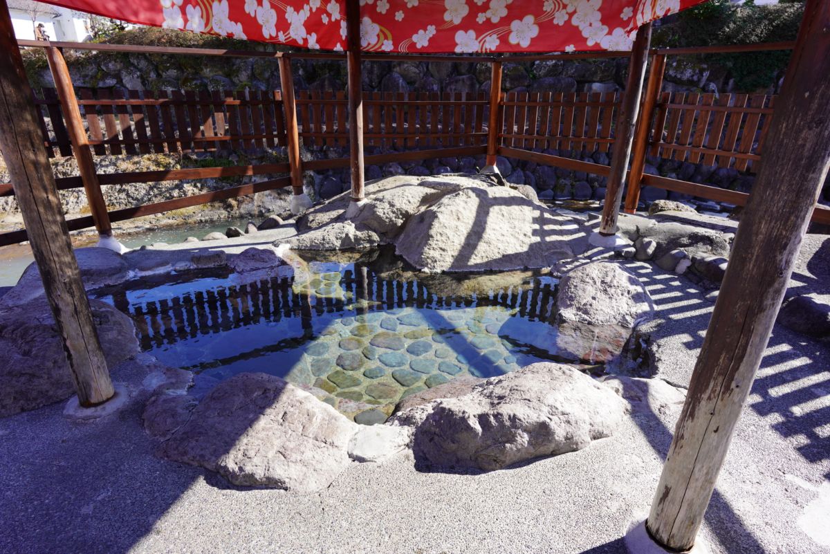 中心部に向かって歩いていると、独鈷の湯という看板が見えてきました。川の真ん中に温泉があったのですが、説明書きを見るとあくまで見るための温泉に現状はなっているようで、景観は良いのに残念だなぁと少し思います。