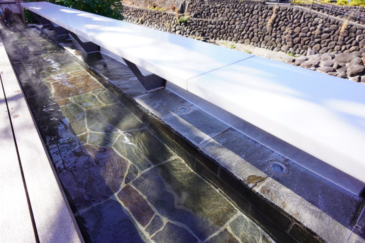 橋の手前の足湯は混雑していたので、橋の向かいの足湯に行ってみることに。ベンチもきれいに整備されていて清潔な足湯です。