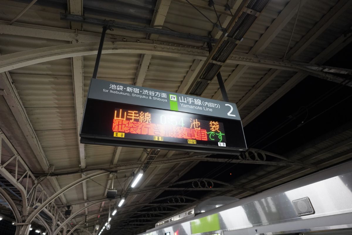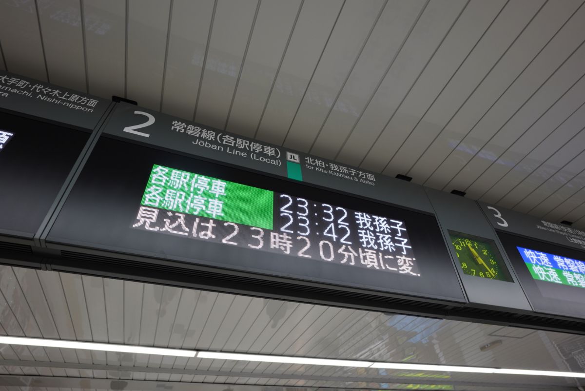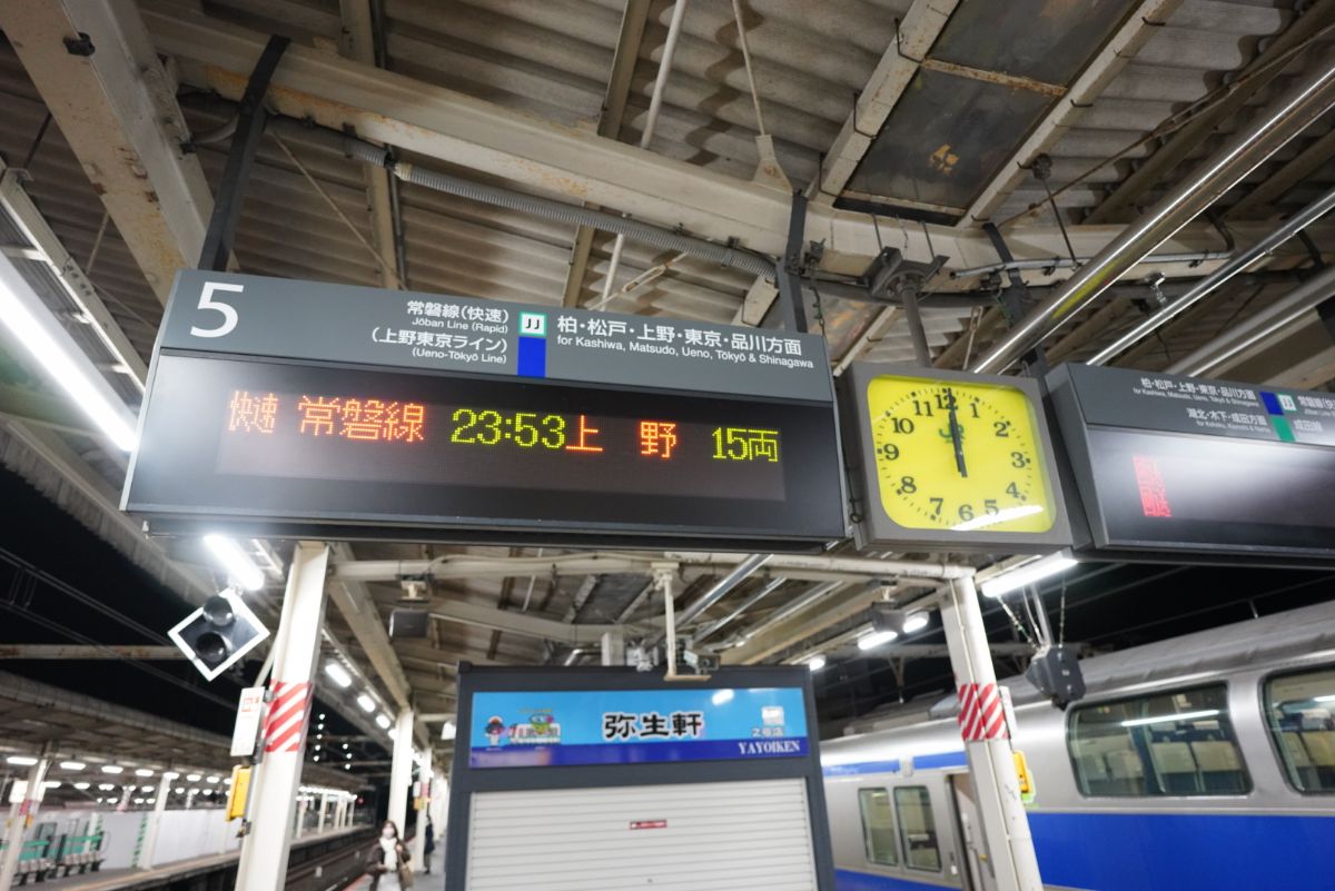 元々の予定の0時02分発は消滅し、23時53分発が上野行き最終列車となりました。山手線の乗換駅の日暮里まで向かいます。