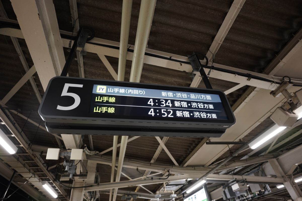山手線内回りの始発列車。この列車が品川駅からの東海道本線始発へと接続する列車となります。なお外回りは25分に先に発車しますが、到着時間は同じ。