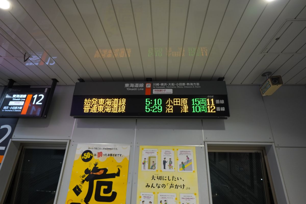 乗車するのは品川始発の小田原行きです。なお次の沼津行きは、以前は373系で静岡行きとして運行されていた「乗り得」列車です。今はただの沼津行きですけどね……。