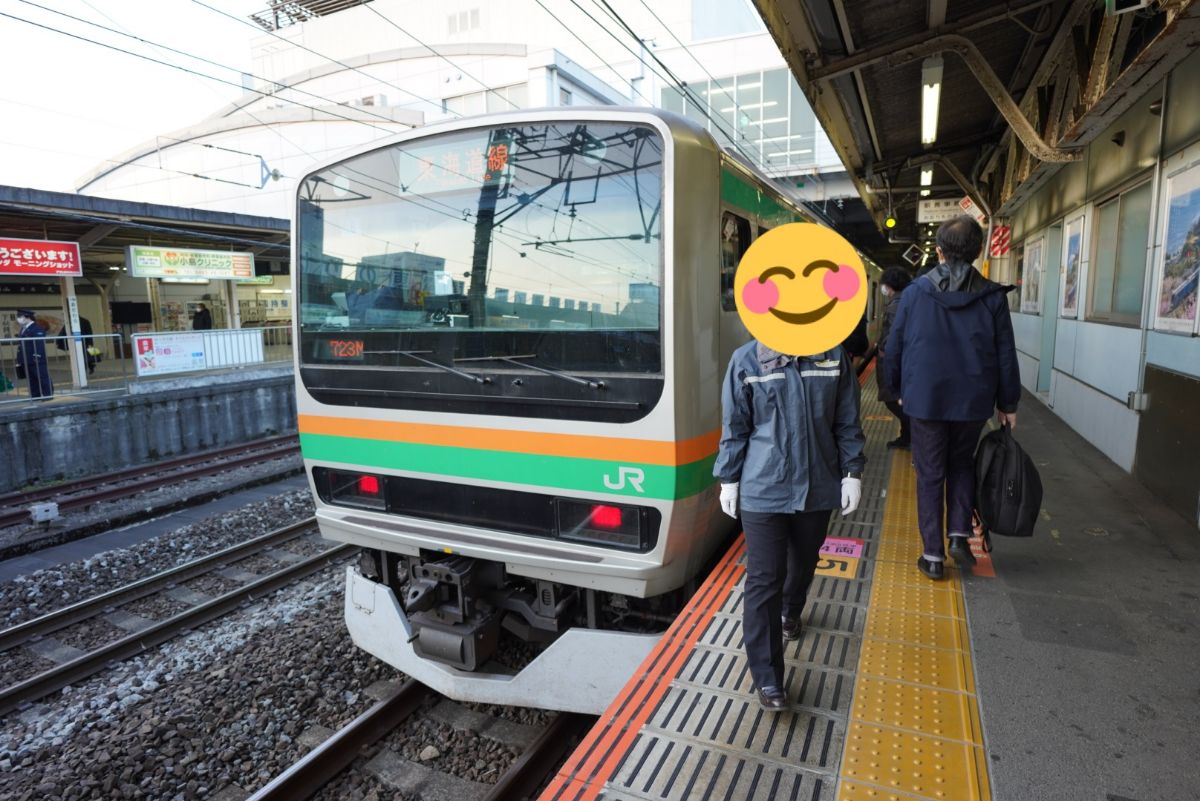 列車は5両編成のE231系。座った瞬間に「固ッ」と思わず声が出てしまうほどの椅子の固さです。板に座ってるレベルの感覚(?)