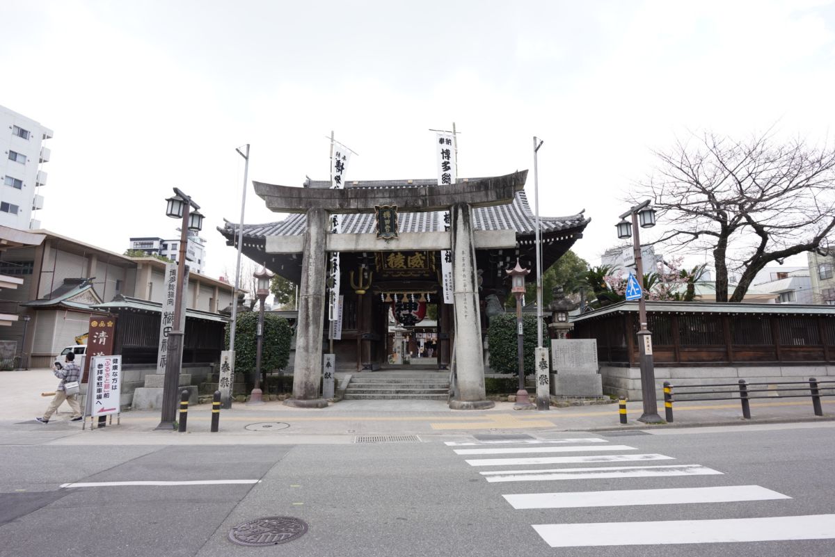 「暇だし、福岡空港までの運賃も変わらないから天神にいこう」という意味不明な理由で歩いていると神社を発見。暇なので参拝していきましょう。