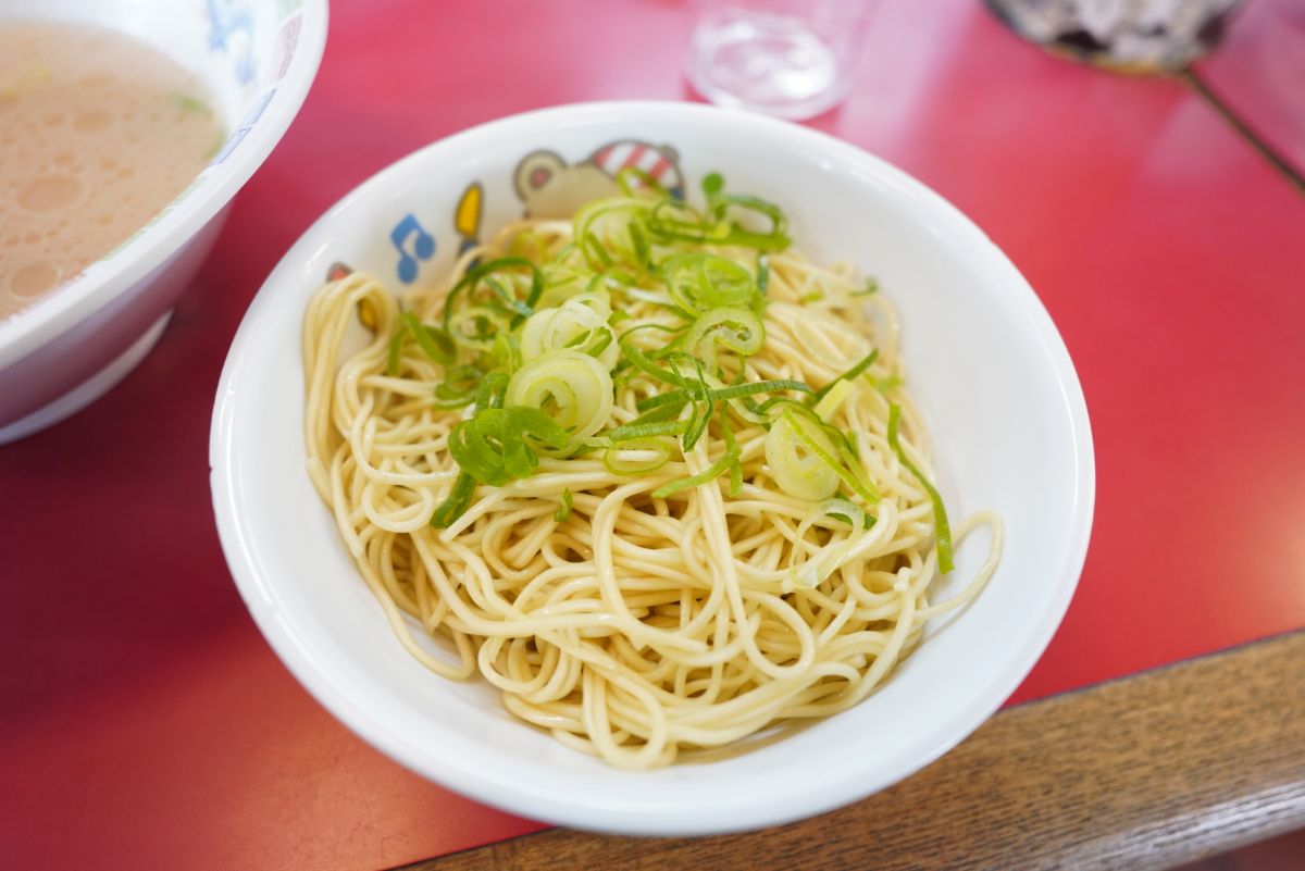 そして博多ラーメンといえば替え玉。替え玉は100円で注文できるので注文して2杯目をいただきます。麺の固さを変えて楽しむのも博多ラーメンの醍醐味ですね。