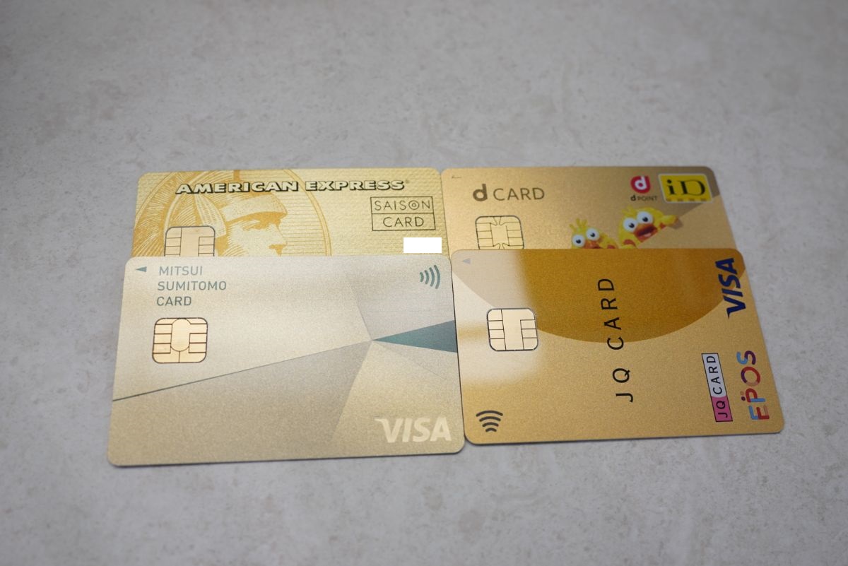 所持しているゴールドカードの中でも使えるのは左上のセゾンアメックスゴールドのみ。