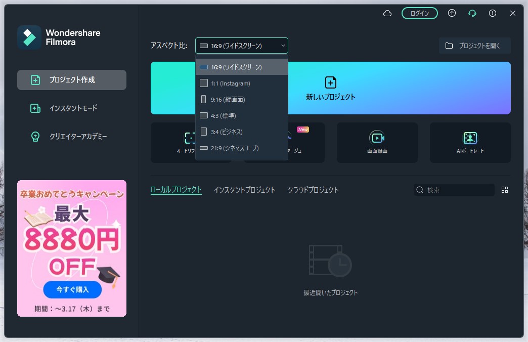 また、「アスペクト比」の部分をクリックすると、主流の16:9から、正方形や縦長の動画などを設定することが可能です。意図的に変更したい場合は、プロジェクト作成前に変更しておきましょう。